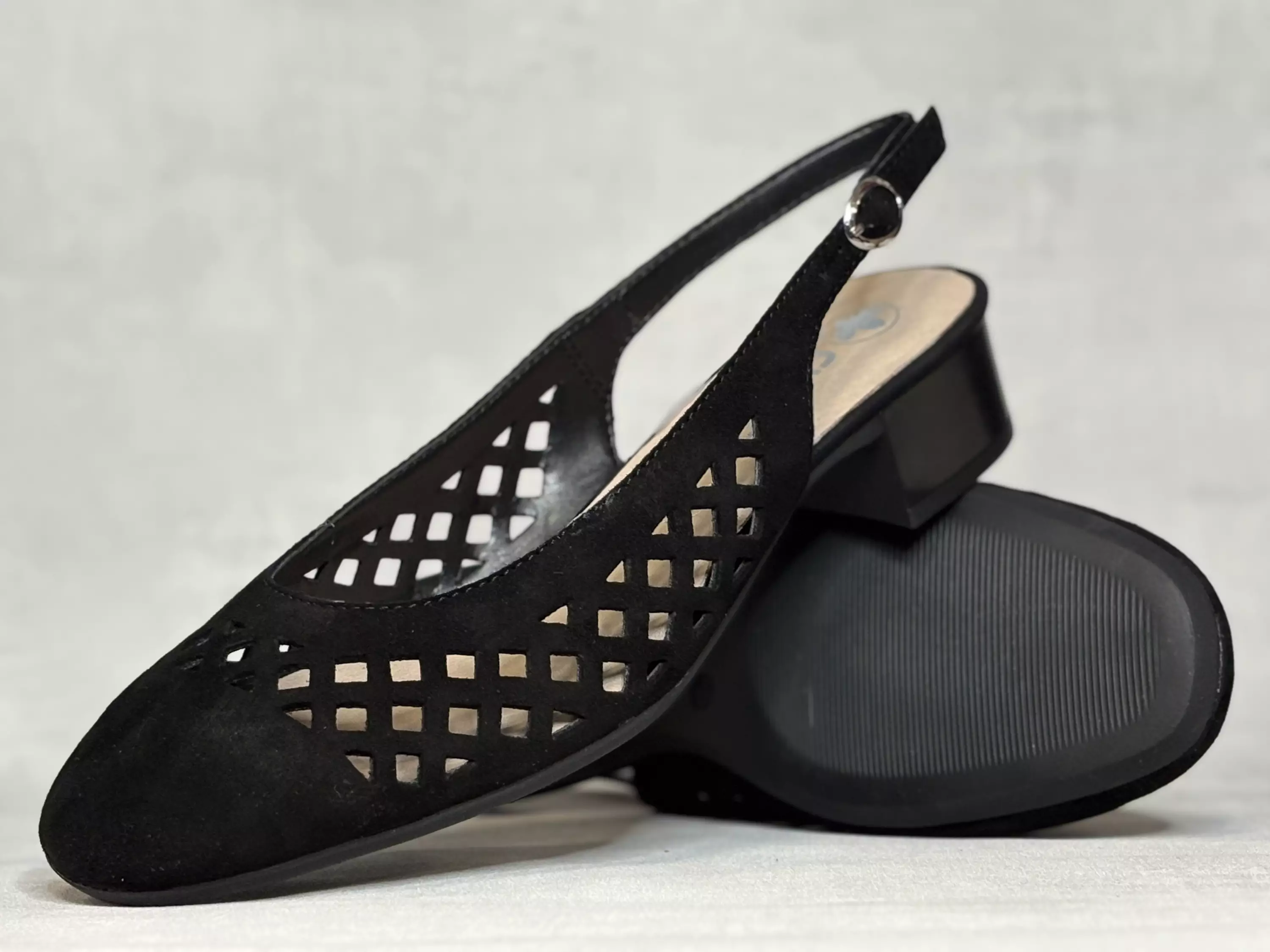 Mustat Rieker sling back korkokengät. Reikäkuvioitu nahkapinta pitää jalat hyvin ilmastoituina. Kantaremmissä pieneen venykkeeseen kiinnitetty hopean värinen soikea solki, jonka avulla voit säätää kengän istuvuutta. Lestimitoitus levehkö H, Riekerin merkintä Extra wide. Kannan korkeus noin 3,5cm ja pohjan korkeus päkiän alta noin 0,5cm.