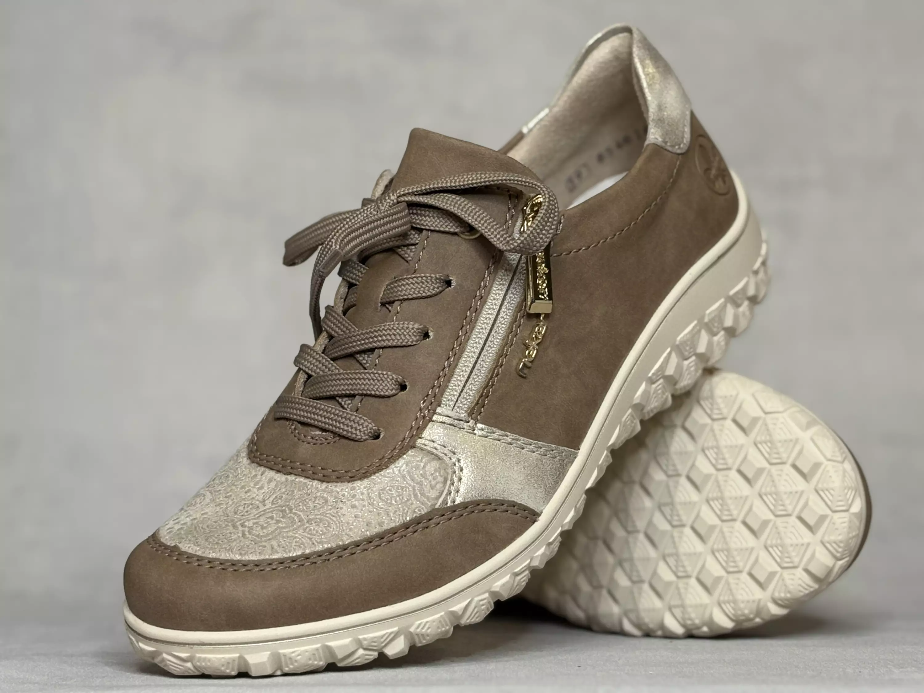 Vaaleanruskeat/beiget Rieker kävelykengät. Nauhoilla ja pukemista vauhdittavalla vetoketjulla varustetut kävelykengät, jotka sopivat sisäsyrjän tekstiiliosion vuoksi mainiosti myös vaivaisenluulliseen jalkaan. Kullan värinen vetokejun vedin sekä ylimmät nauhoituksen sirkkarenkaat. Vaihdettavat pohjalliset, joten tarvittaessa sujautat kenkiin omia tarpeitasi parhaiten vastaavat pohjalliset. Rieker Extra Wide, eli leveähkö H-lesti. Kannan korkeus noin 3,5cm ja pohjan korkeus päkiän alta noin 1,5cm.