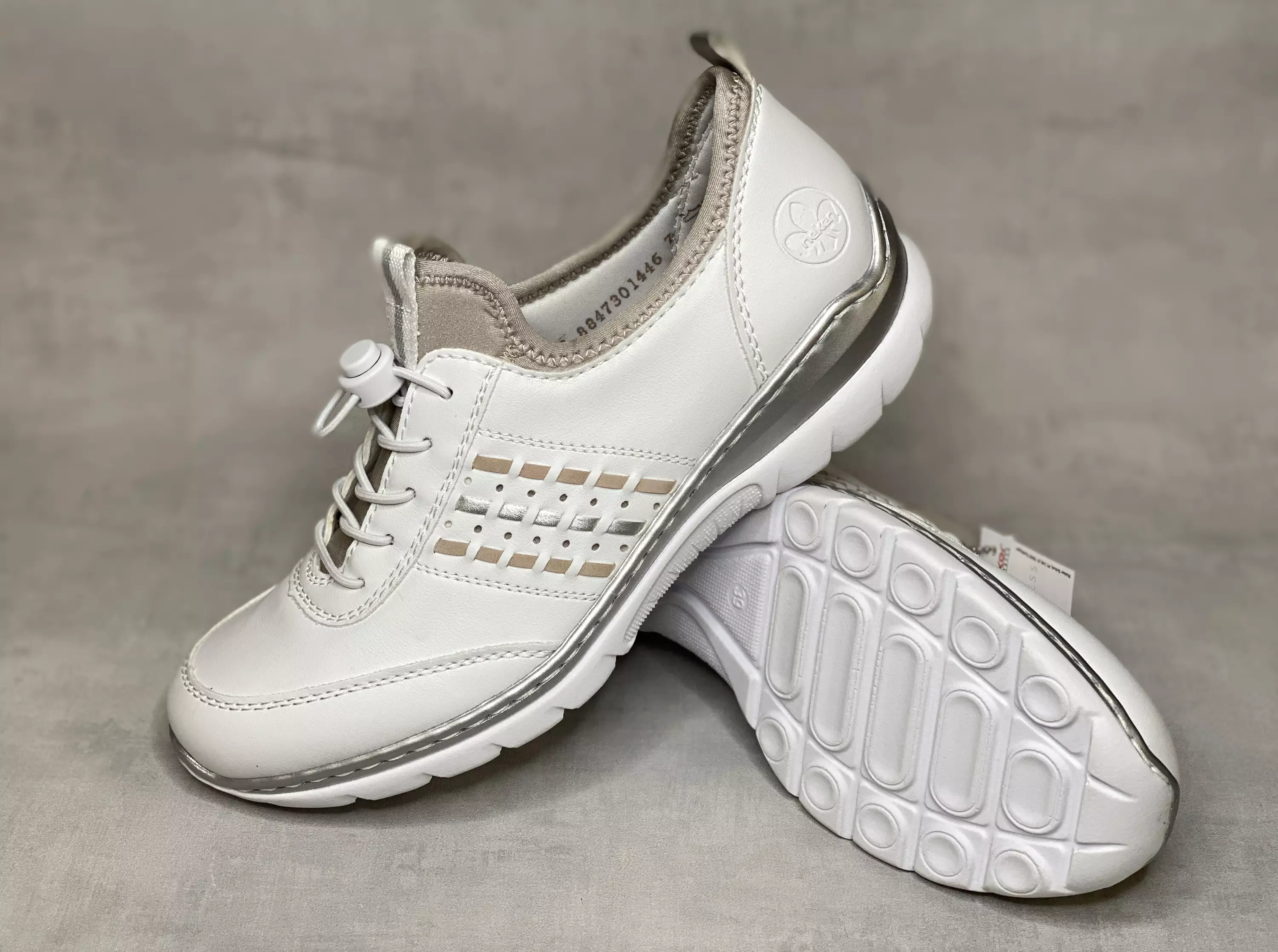 Valkoiset Rieker kävelykengät. Ulkosyrjällä hopean ja nudenvärisiä raitoja sekä reikäkuviointi. Näissä kävelykengissä on säädettävät venykenauhat. Kengissä on jalkaan mukautuvat Rieker antistress-pohjalliset.