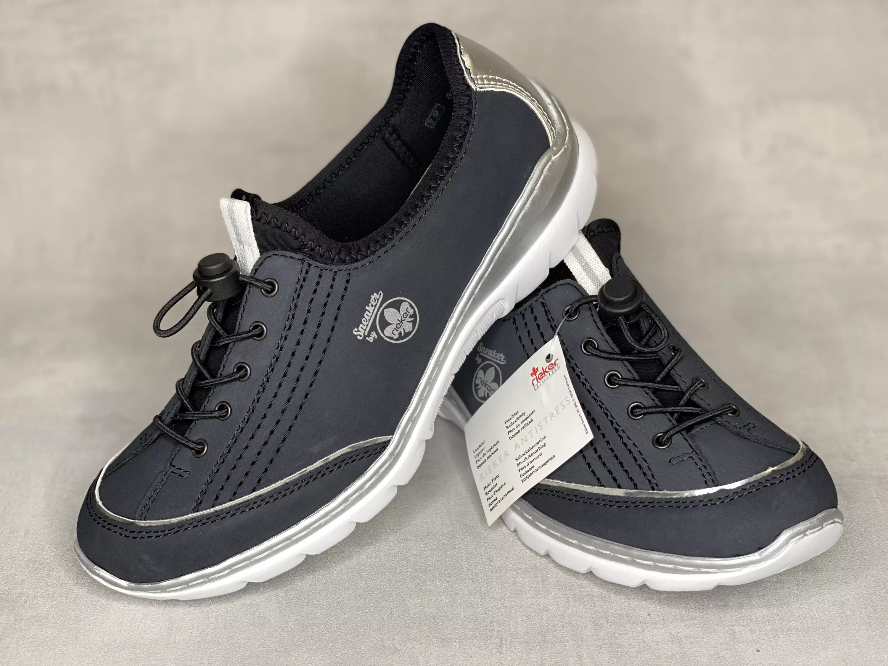 Tummansiniset Sneaker by Rieker kävelykengät. Säädettävällä venykenauhalla varustetut kävelykengätt, joisa on pehmeä ja jalkaan mukautuva MemoSoft-pohjallinen. Pohjan sivussa, kengän kärjessä ja kannassa hopeanväriset yksityiskohdat.