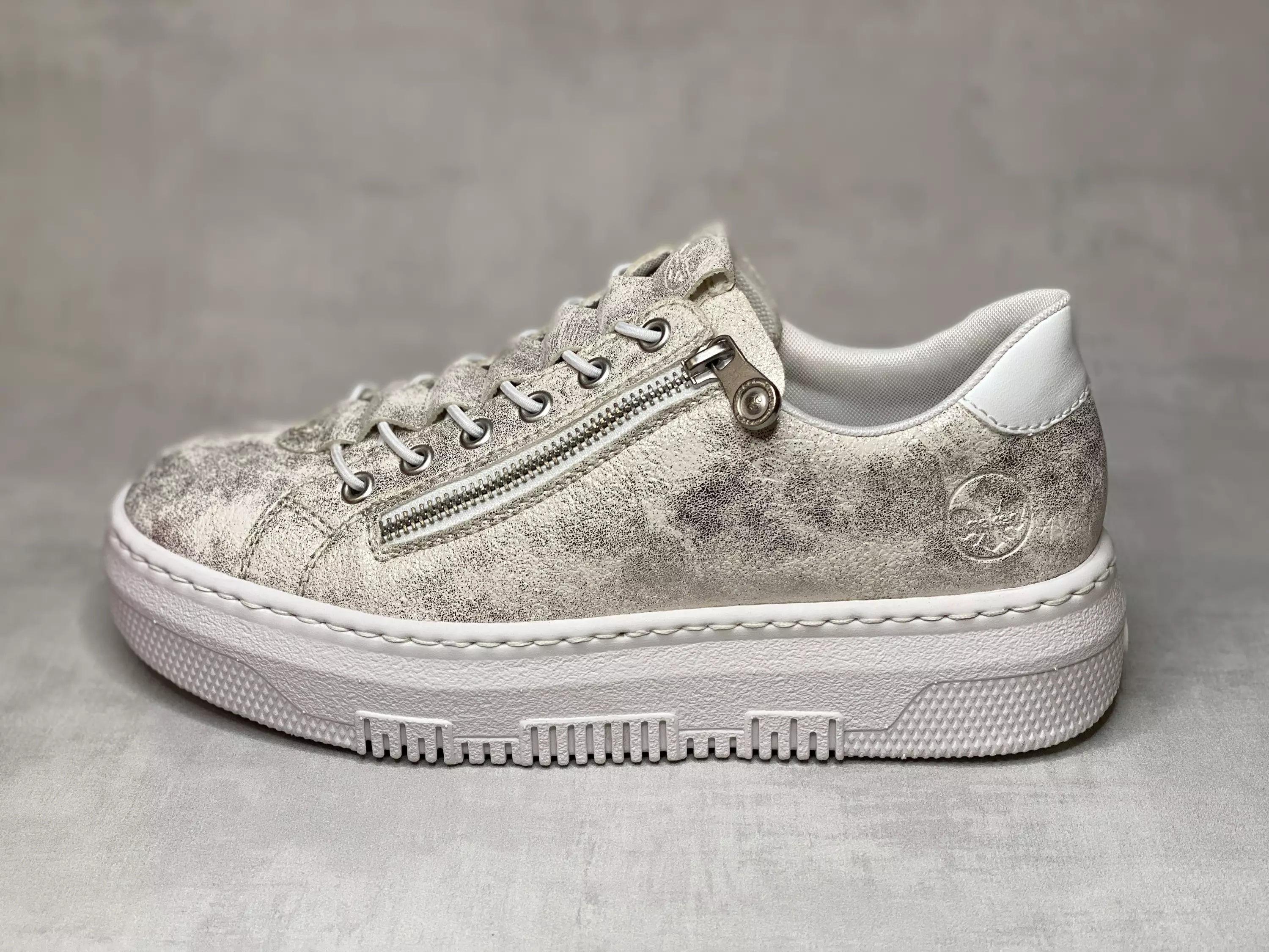 Valkoiset Rieker tennarit. Valkoisessa pinnassa metallinhohtoinen kuviointi. Venykenauhaiset (nauhat eivät ole säädettävät) paksupohjaiset tennarit, joiden ulkosyrjällä on pukemista helpottava vetoketju. Kannan korkeus noin 4cm, pohjan korkeus edestä noin 3cm.