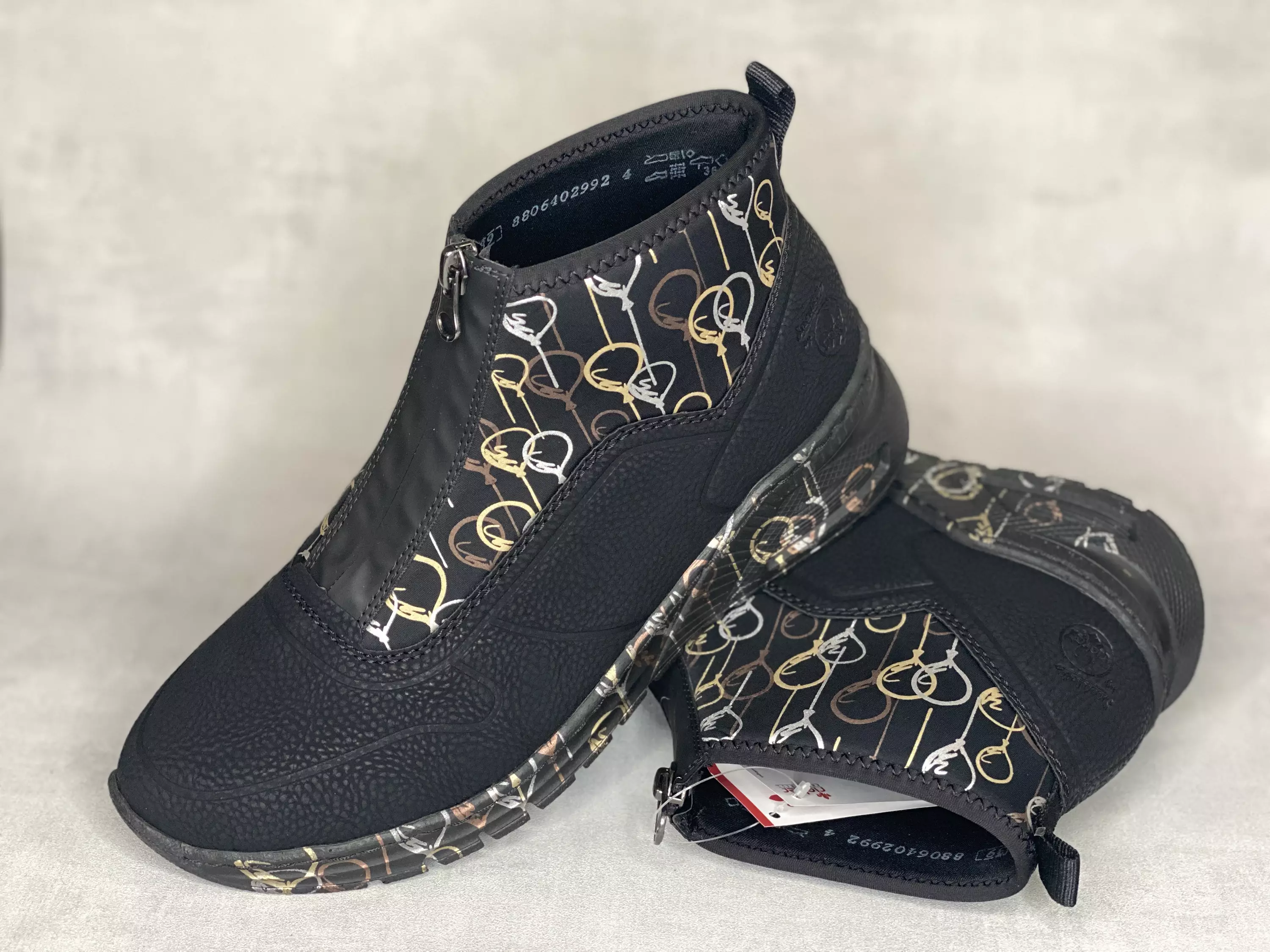 Mustat Rieker nilkkurit. Metalliväreissä hehkuva ilmapallokuvio, joka jatkuu myös ulkopohjan ulkosivulla. Kengän päällä on vetoketju. Varsiosa on kevyesti joustavaa tekstiiliä. MemoSoft-pohjalliset ovat irrotettavat, joten tarpeen vaatiessa vaihdat kenkiin omia tarpeitasi parhaiten vastaavat pohjalliset.