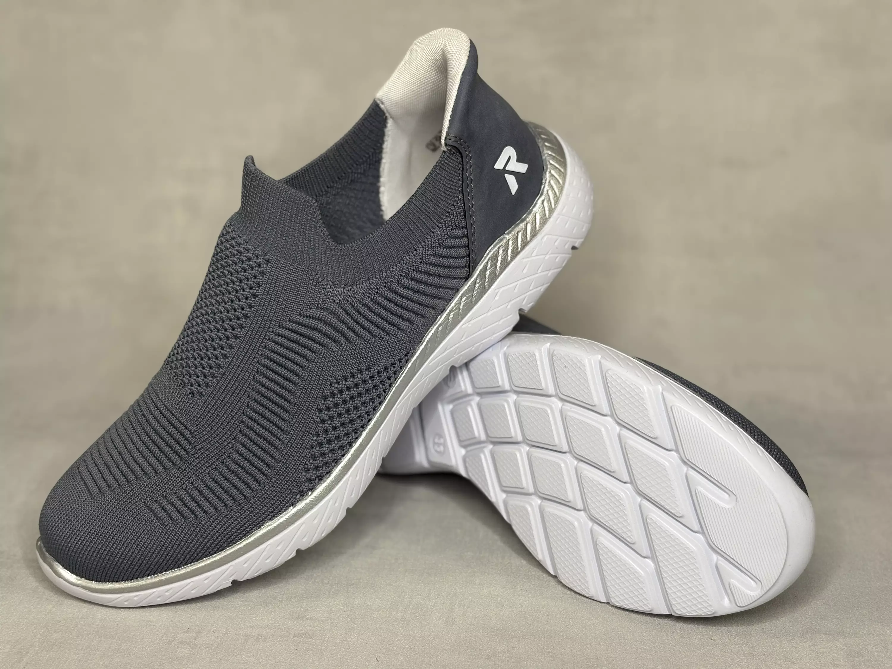 Siniset Rieker lenkkarit. Ready2Go kenkälusikkakanta vauhdittaa pukemista. Kevyesti joustava tekstiilipinta. Jalan alla mukautuvat Rieker Soft-pohjalliset. Kannan korkeus noin 3cm ja pohjan korkeus päkiän alta noin 1,5cm.