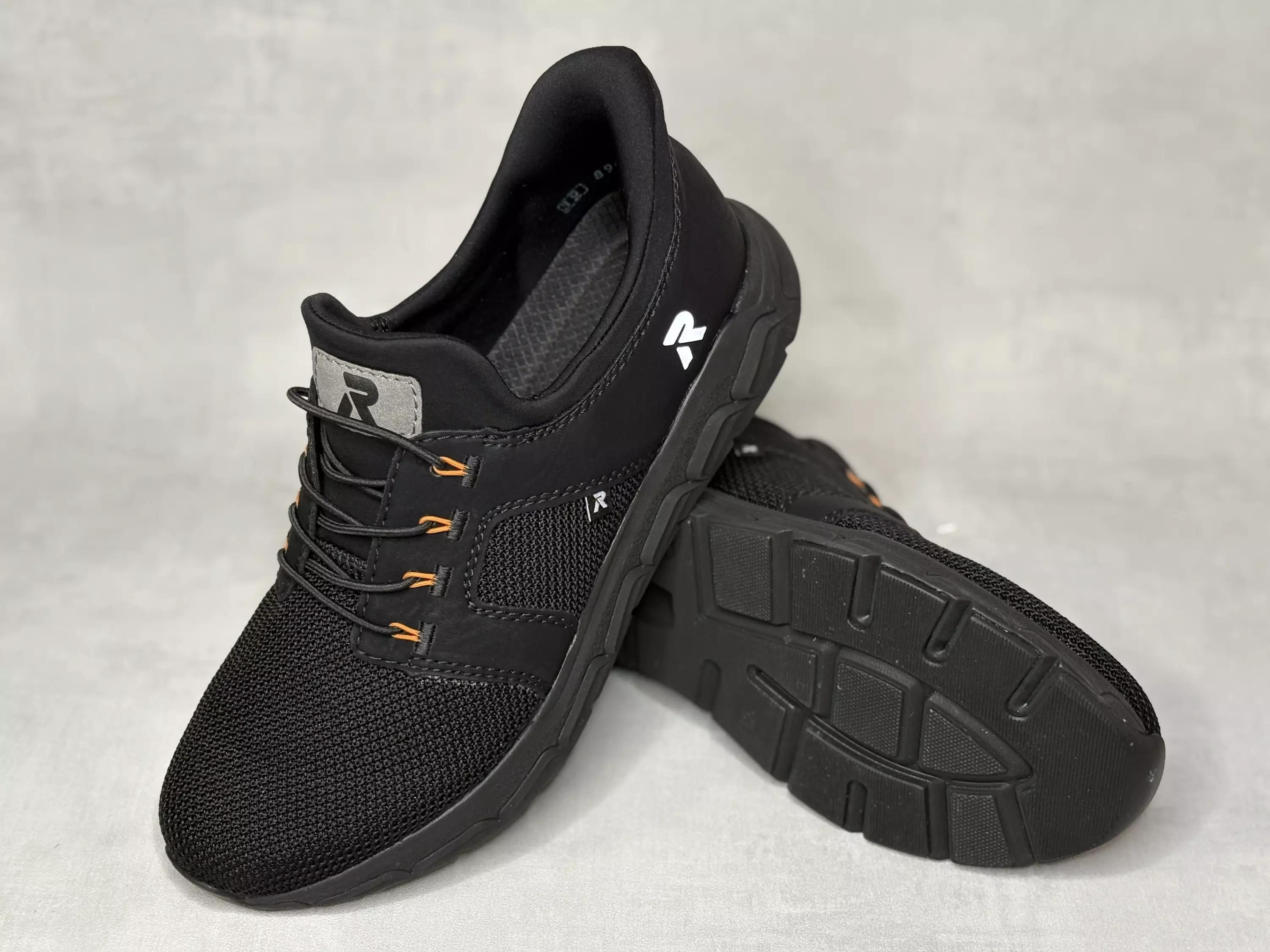 Mustat Rieker lenkkarit. Ready2Go kenkälusikkakanta vauhdittaa pukemista. Joustavat venykenauhat (eivät ole säädettävissä). Vaihdettavat Rieker Soft-pohjalliset, joten tarvittaessa sujautat kenkiin omia tarpeitasi parhaiten vastaavat pohjalliset. Kannan korkeus noin 3cm ja pohjan korkeus päkiän alta noin 2cm.