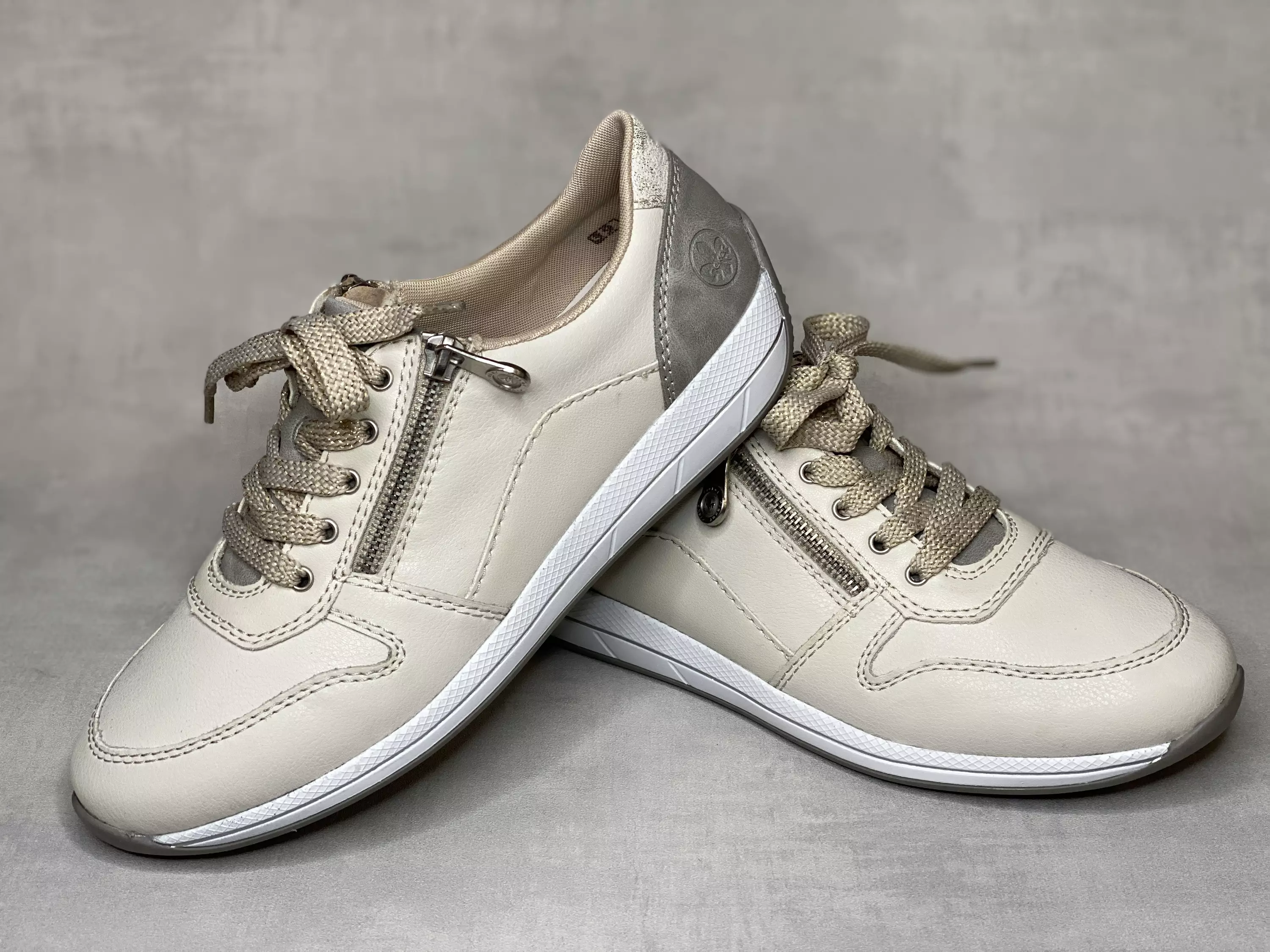 Luonnonvalkoiset Rieker kävelykengät. Harmaa kantakappale sekä iltti. Kannan yläosassa yksityiskohtana kimaltava kaitale. Kullankimalteisilla nauhoilla ja kahdella vetoketjulla varustetut citytennarit. Leveälestiset kengät, joissa on myös vaihdettavat pohjalliset.