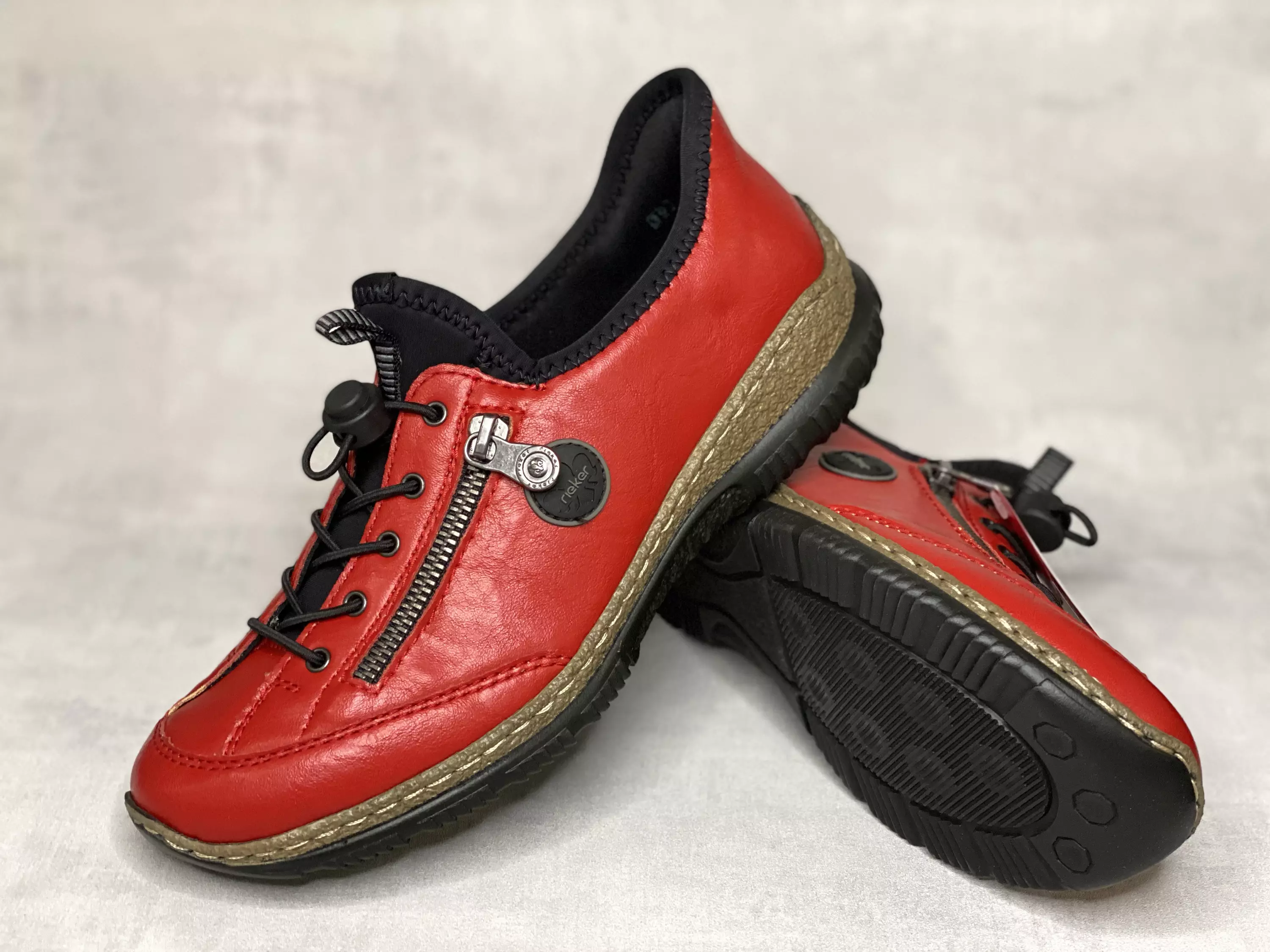 Punaiset Rieker kävelykengät. Riekerin Ready2Go kenkälusikkakannalla varustetut Rieker tennarit! Venykenauhaiset kävelykengät, joiden ulkosyrjällä koristevetoketju. Kiinteät jalan alla mukautuvat Rieker Antistress pohjalliset.
