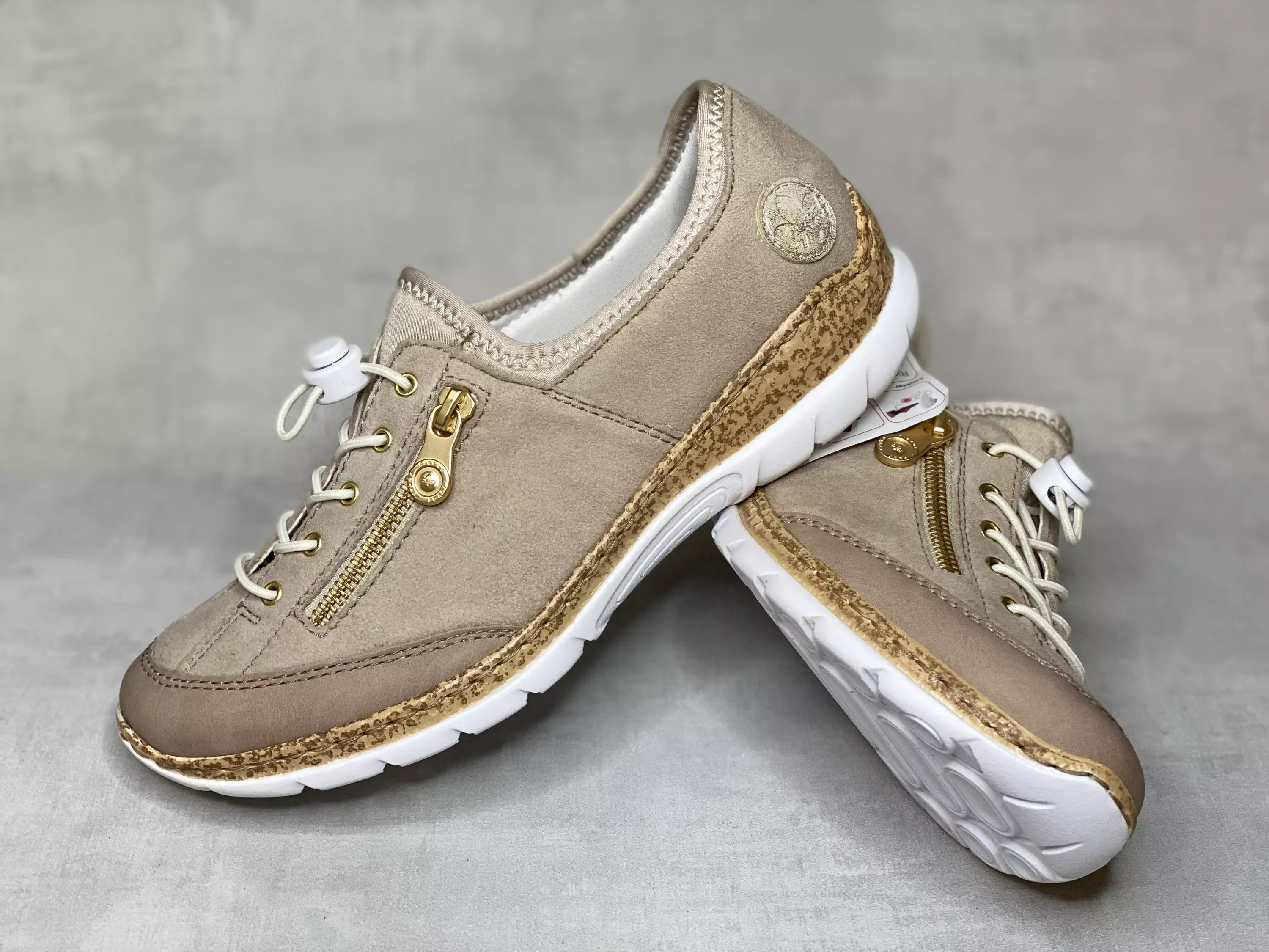 Beiget Rieker kävelykengät venykenauhoilla. MemorySoft sisäpohjalla varustetut kävelykengät ovat todelliset kestosuosikit! Nauhoja ei tarvitse solmia, mutta tarvittaessa voit niitä kiristää nopealla pikalukituksella. Ulkosyrjällä on yksityiskohtana kullan värinen koristevetoketju.