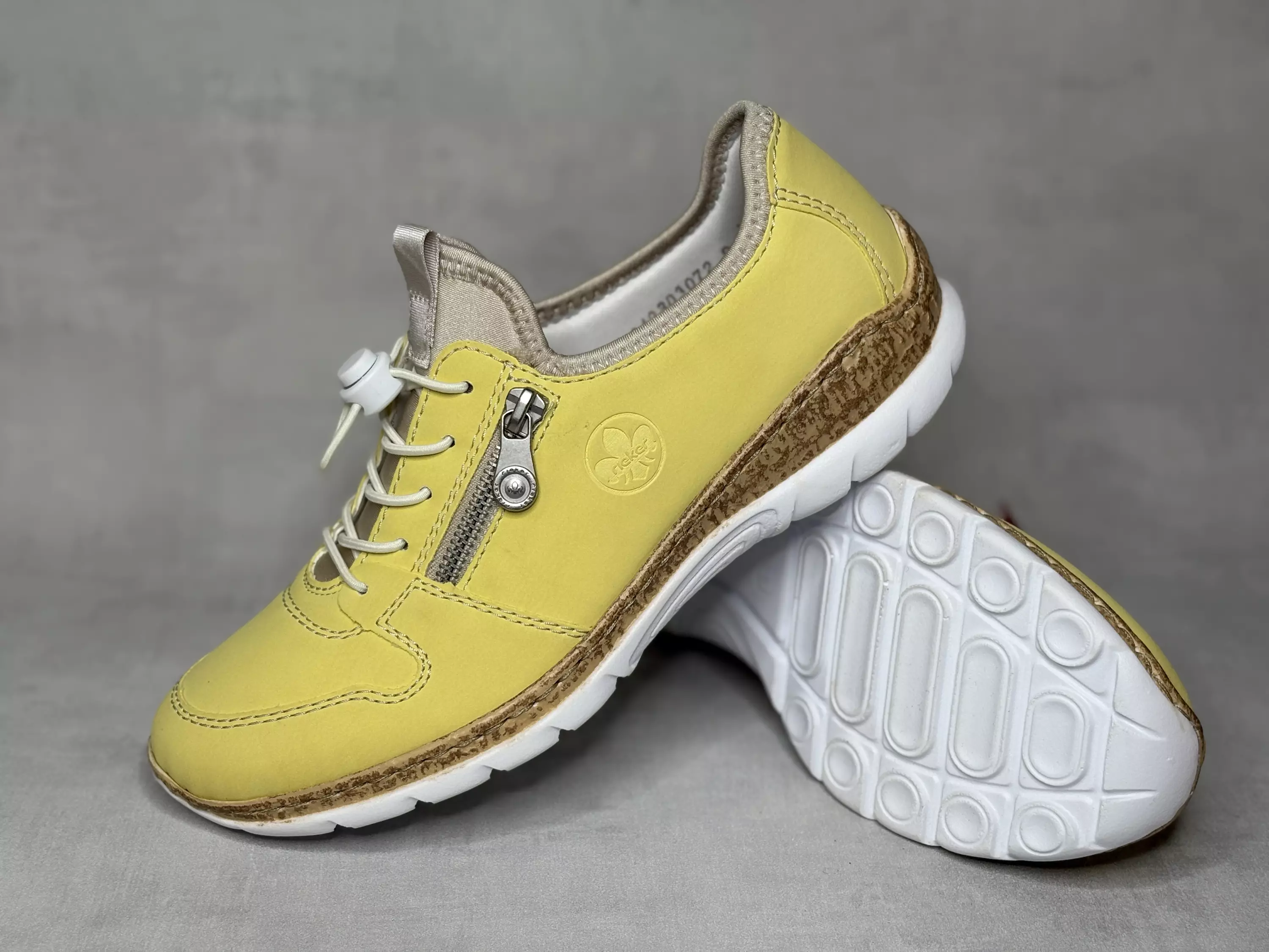 Keltaiset Sneaker by Rieker tennarit. Säädettävät venykenauhat, joiden alla beige tekstiili. Jalkaan mukautuvat MemoSoft pohjalliset. Ulkosyrjällä ilmettä antaa koristevetoketju. Kannan korkeus noin 3cm ja pohjan korkeus päkiän alta noin 1,5cm