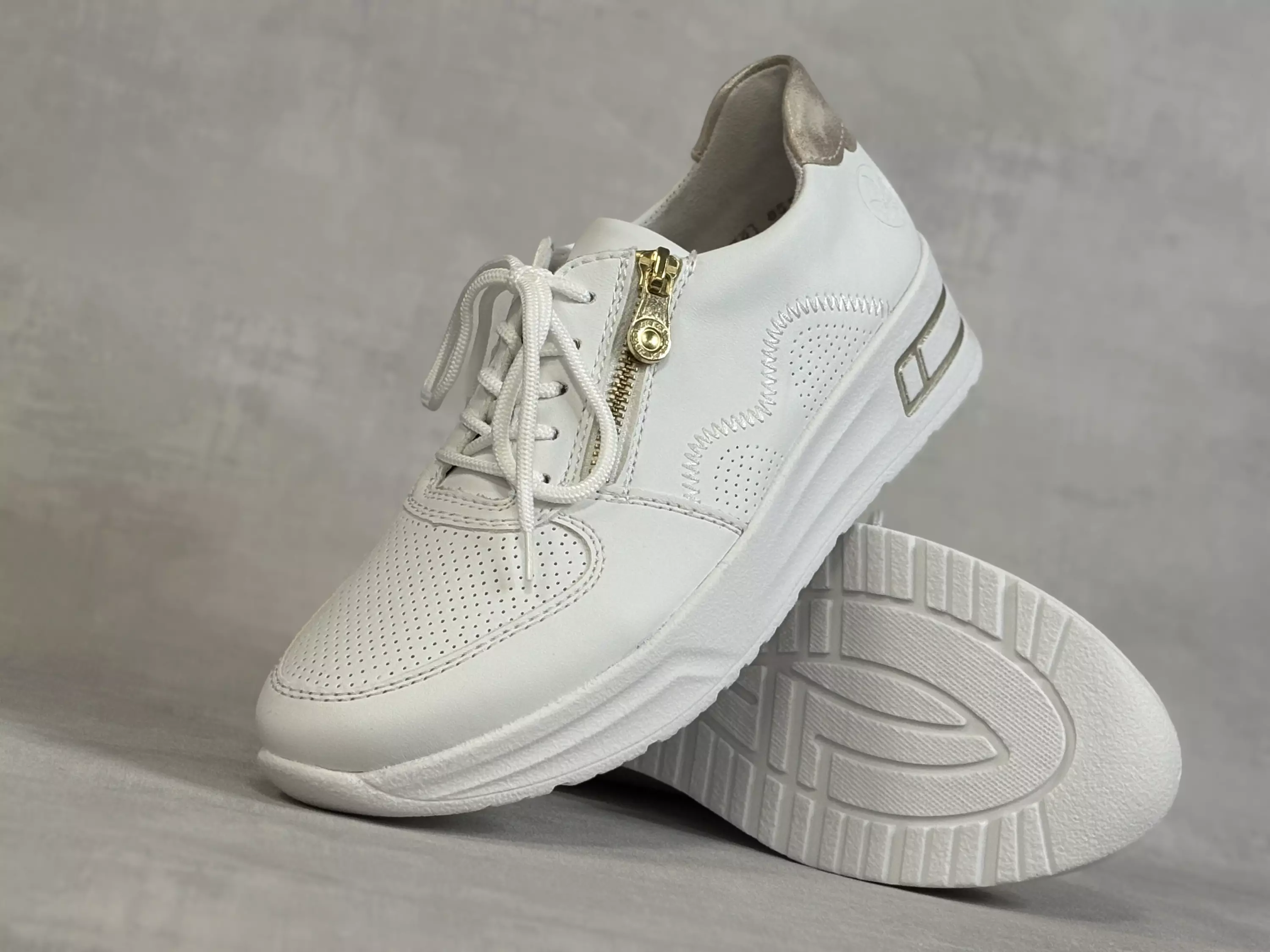 Valkoiset Rieker kävelykengät. Nauhalliset kävelykengät. Ulkosyrjällä kullan värinen vetoketju, joka helpottaa pukemista ja toimii myös kenkien yksityiskohtana! Vaihdettavat Rieker AntiStress pohjalliset, joten tarvittaessa sujatat kenkiin omia tarpeitasi parhaiten vastaavat pohjalliset. H-lesti, jonka Rieker merkitsee extra wide-merkinnällä. Kannan korkeus noin 4cm ja pohjan korkeus päkiän alta noin 2cm.