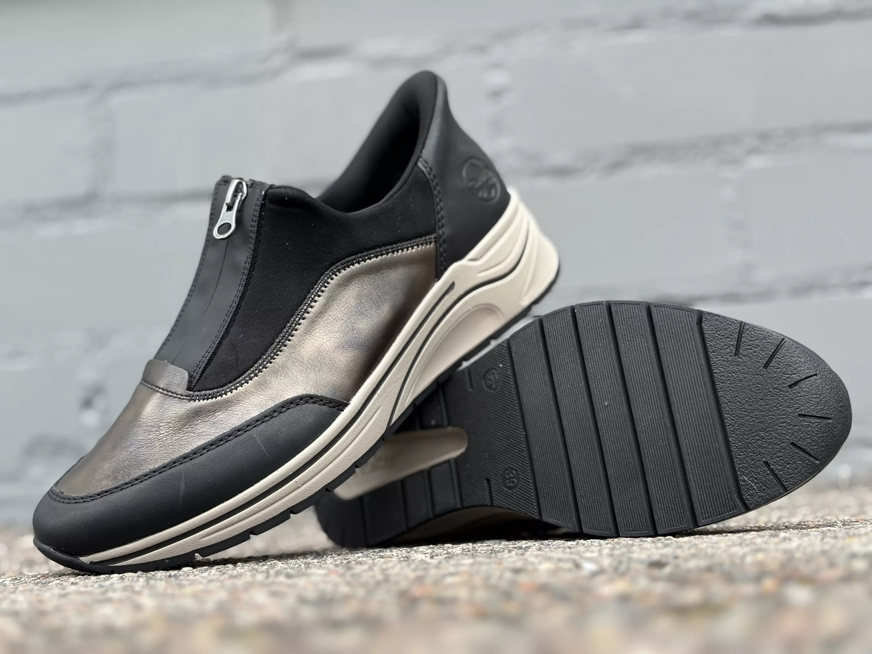Mustat Rieker lenkkarit. Aksenttivärinä metallinhohtoisen ruskea kärkikappale sekä sisä- ja ulkosyrjä. Ready2Go kenkälusikkakannalla varustetut kiilapohjaiset citylenkkarit. Kengän päällä vetoketju. Rieker Antistress-pohjalliset ovat vaihdettavat, joten tarvittaessa sujautat kenkiin omia tarpeitasi parhaiten vastaavat pohjalliset. Lestimitoitukseltaan kengät ovat H-lestiset, Riekerin merkintä Extra Wide. Kannan korkeus noin 4cm ja pohjan korkeus päkiän alta noin 1,5cm.