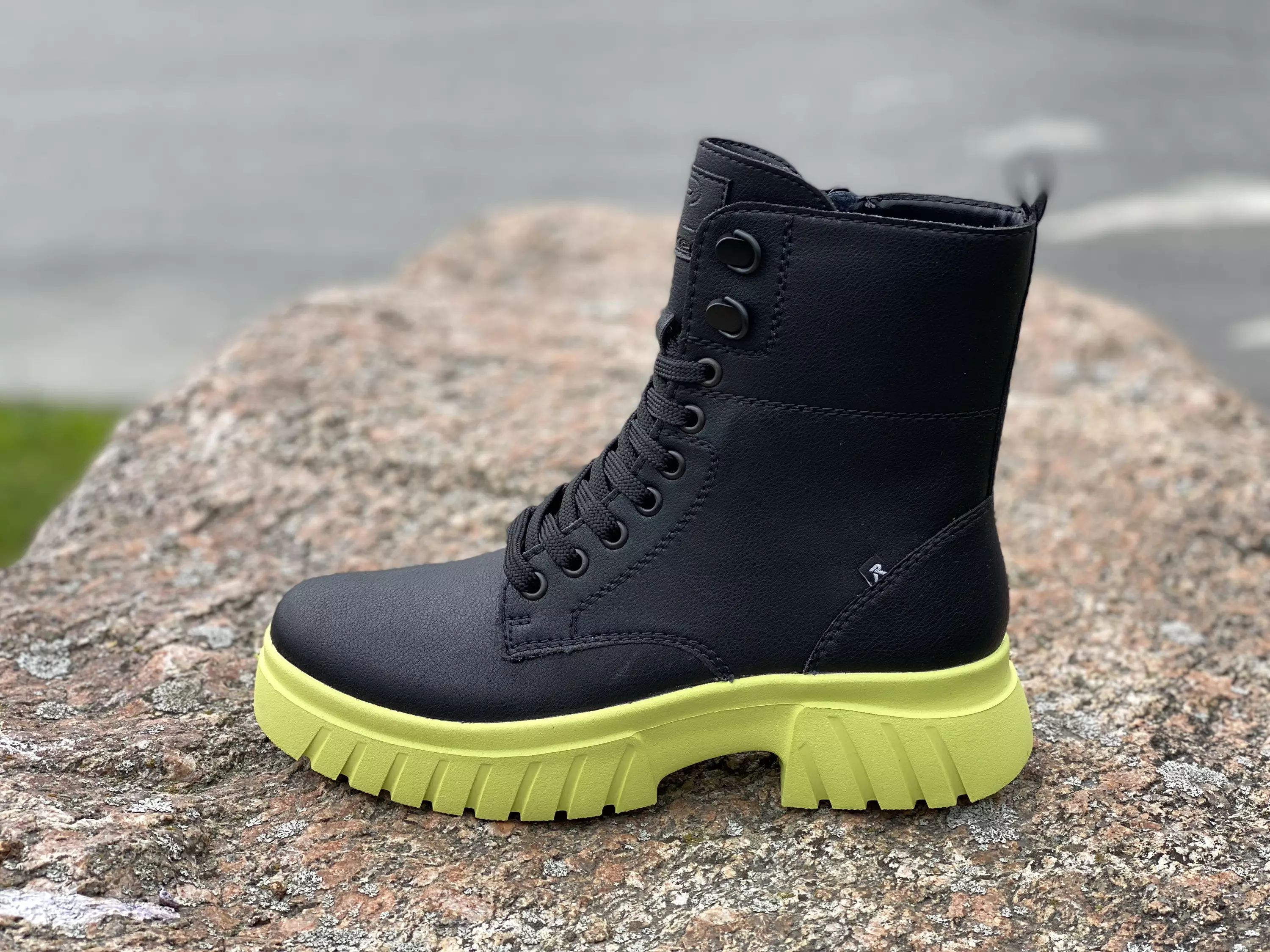 Mustat Rieker Revolution maiharit. Näyttävällä keltavihreällä pohjalla varustetut maiharit eivät takuulla kävele joka jalassa vastaan! Sisäsyrjällä pukemista vauhdittava vetoketju. Nauhojen avulla kengät säätyvät sopivan kireälle omaan jalkaan. Muotoillut Rieker Revolution pohjalliset ovat vaihdettavat, joten tarvittaessa sujautat niiden tilalle omia tarpeitasi parhaiten vastaavat pohjalliset. Tekstiilinen vuori. Kannan korkeus noin 4,5cm, pohjan korkeus päkiän alta noin 3cm.