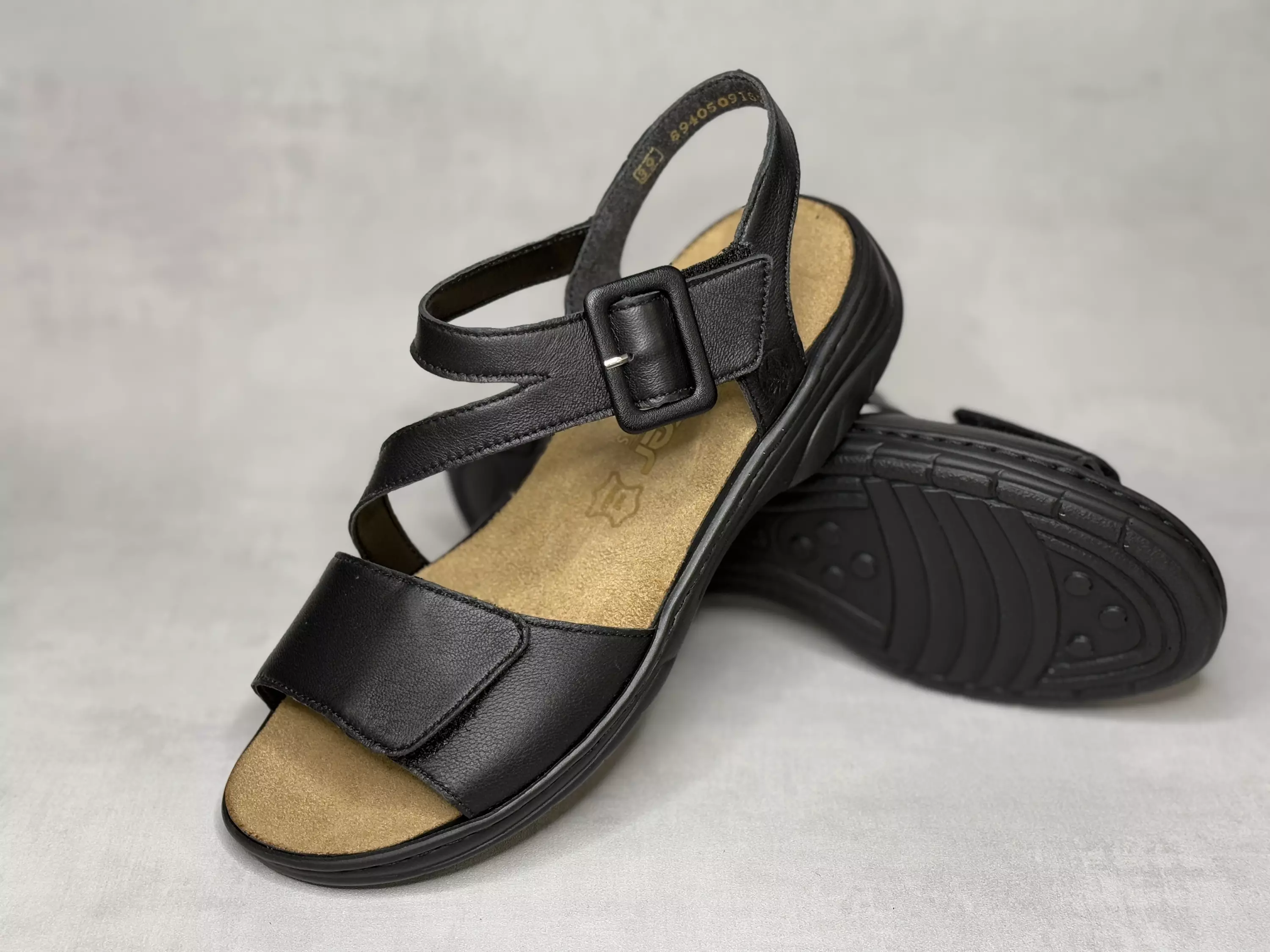 Mustat Rieker sandaalit kahdella tarrasäätöisellä remmillä, joissa ylemmässä solkikoriste. Vaihdettavat pohjalliset.