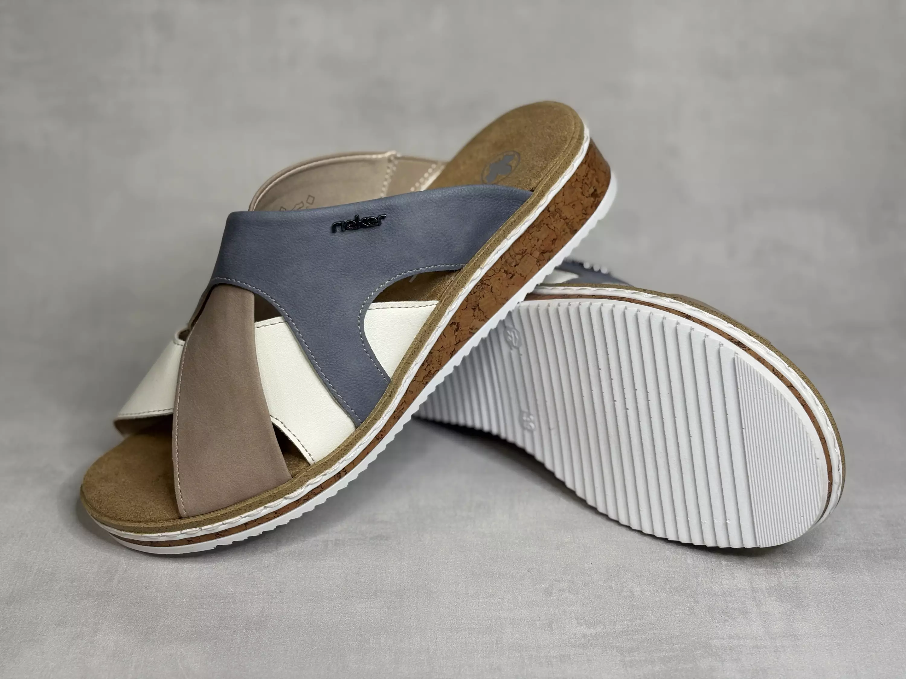 Moniväriset Rieker sandaalit. Kiilapohjaiset sandaalit, joiden mielenkiintoisesti muotoillut remmit ovat väriltään siniset, valkoiset ja vaalean beiget. Beigessä remmissä sissyrjällä sandaaleiden istuvuutta parantava venyke. Jäykkä ulkopohja. Kannan korkeus noin 3,5cm ja pohjan korkeus päkiän alta noin 1,5cm.