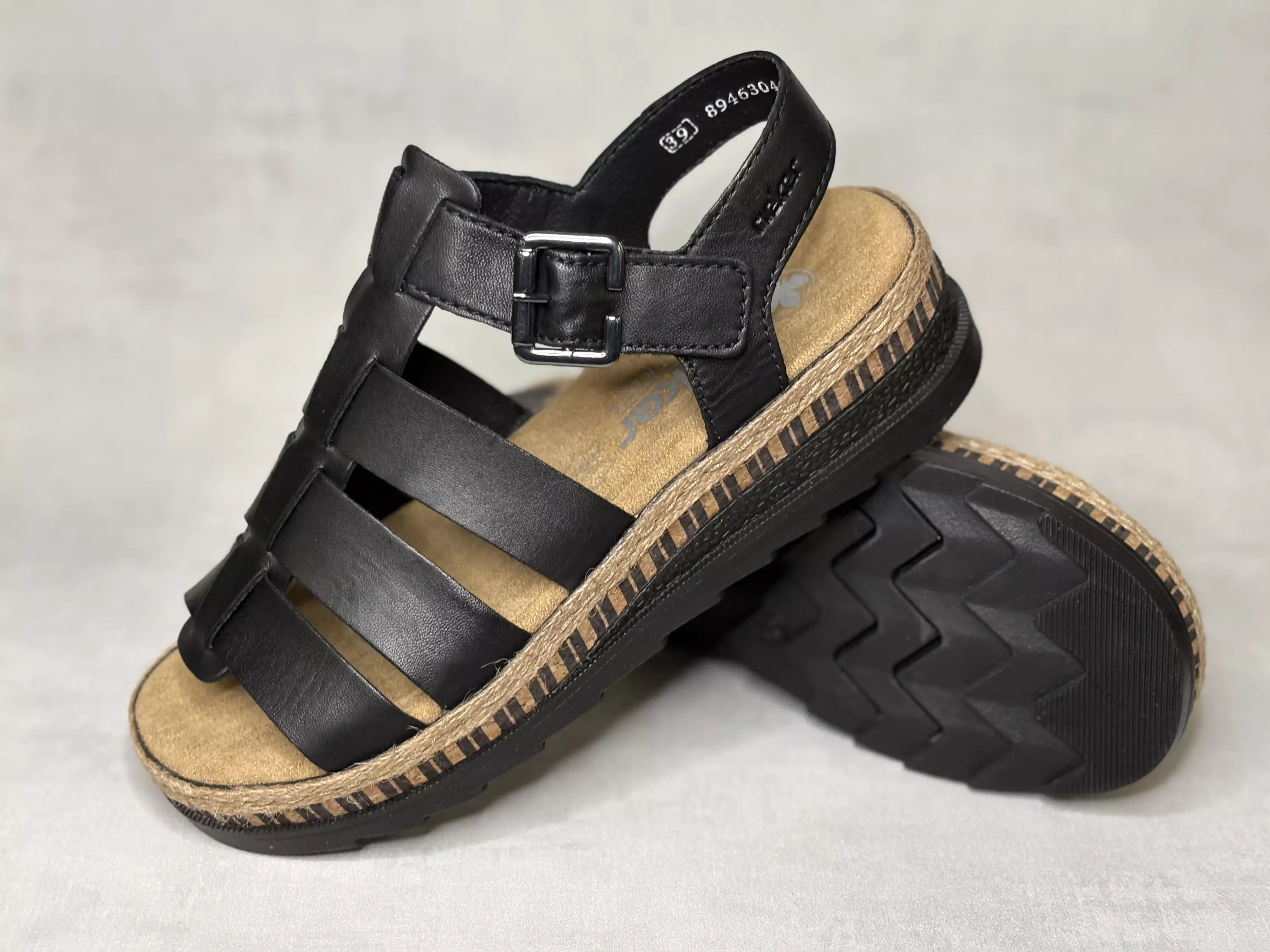 Mustat Rieker sandaalit. Kiilapohjaiset nahkaiset remmisandaalit tarrasäätöisellä remmillä, jossa metallinen koristesolki. Kantaremmin ulkosyrjällä nahkaan painettu Rieker-logo. Tekstiilipintainen Rieker antistress sisäpohja. Musta ulkopohja ja pohjan sivuissa musta-korkkikuvioinen koristeraita. Pohajn yläreunassa ruskea punos. Kannan korkeus noin 5cm ja pohjan korkeus päkiän alta noin 3cm.