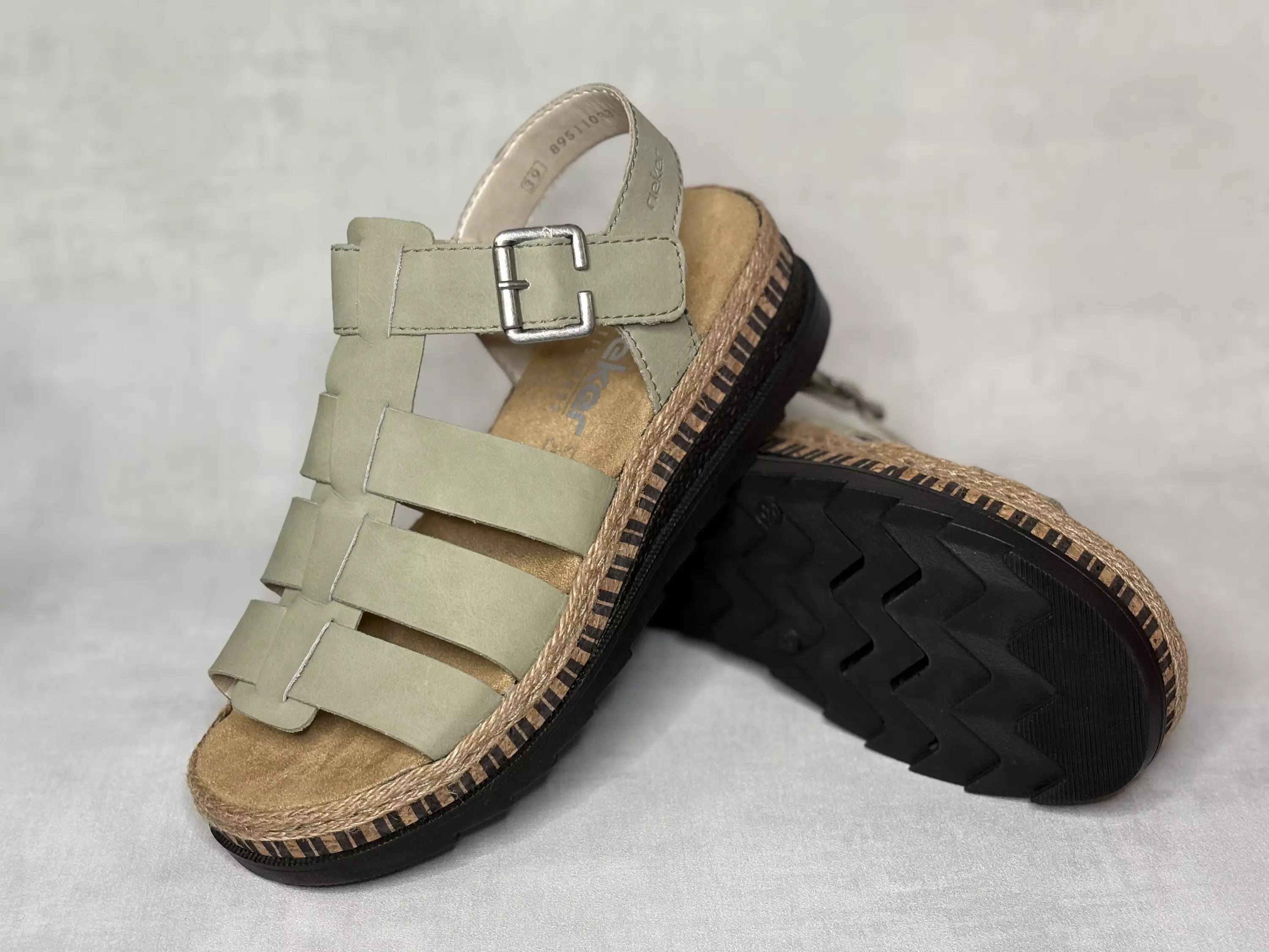 Pistaasinvihreät Rieker sandaalit. Kiilapohjaiset nahkaiset remmisandaalit tarrasäätöisellä remmillä, jossa metallinen koristesolki. Kantaremmin ulkosyrjällä nahkaan painettu Rieker-logo. Tekstiilipintainen Rieker antistress sisäpohja. Musta ulkopohja ja pohjan sivuissa musta-korkkikuvioinen koristeraita. Pohjan yläreunassa vaaleanruskea punos. Kannan korkeus noin 5cm ja pohjan korkeus päkiän alta noin 3cm.