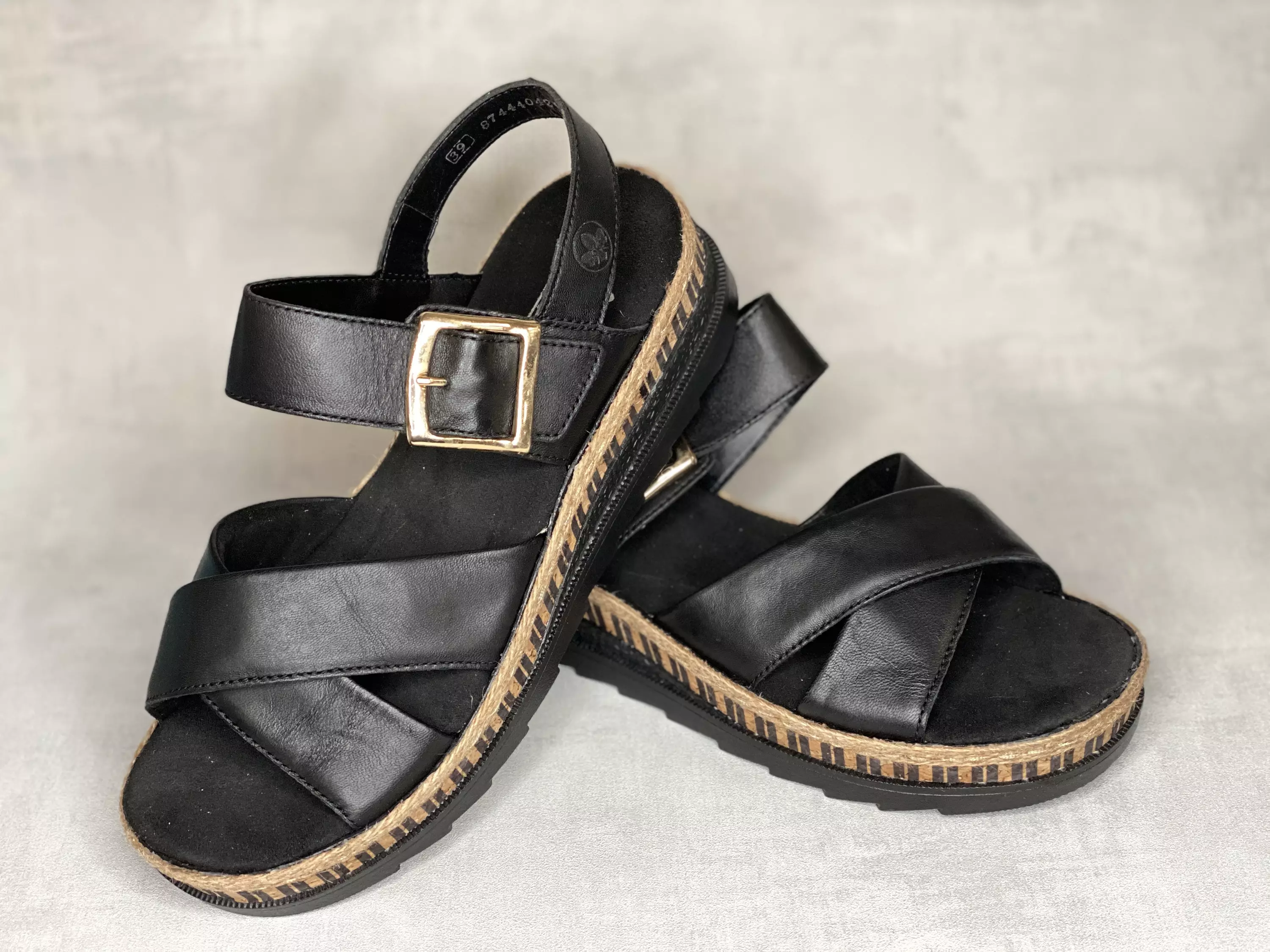 Mustat kiilapohjaiset Rieker sandaalit. Sandaalien tarrasäätöisessä remmissä on kullanvärinen koristesolki. Sandaaleiden kärjessä olevat remmit menevät ristiin ja kenkä on niiden alta melko matala. Kiilapohjan yläreunaa kiertää tekstiilipunos, jonka alla on mustaa ja korkkimateriaalin ruskeaa yhdistävä raita ja ennen ulkopohjaa kannan puolelta löytyy vielä matala rouheapintainen osio. Musta sisäpohja on pehmeä jalan alla.