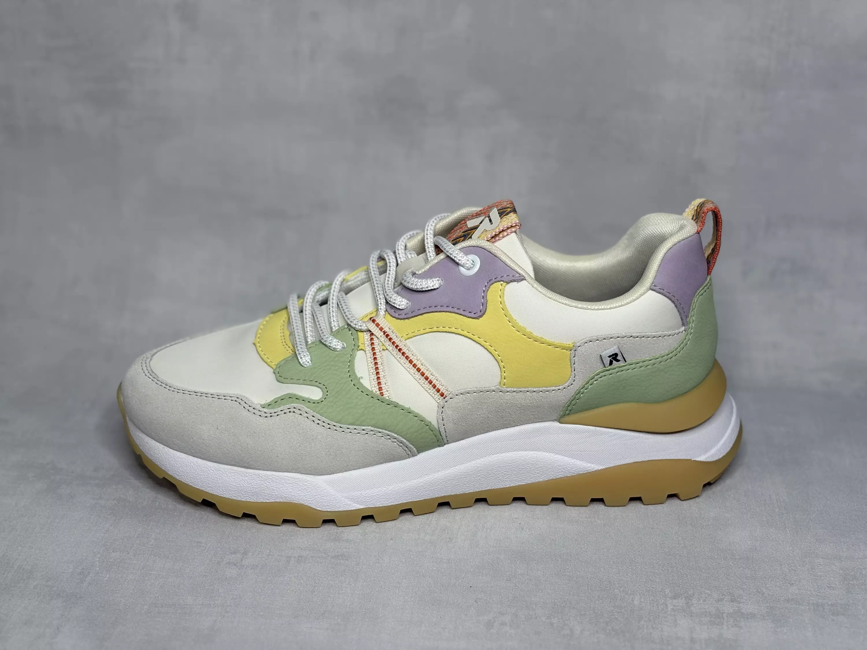 Pastelliväreissä koreilevat moniväriset Rieker kävelykengät. Pinnassa vaihtelevat pastellisävyinen violetti, vihreä, keltainen ja harmaa. Pääväriltään kengät ovat valkoiset. Nauhojen avulla kengät on helppo säätää omaa jalkaan sopiviksi. Kannassa ja iltissä tekstiilinen vetolenkki. Vaihdettavat Rieker Soft pohjalliset, joten tarvittaessa sujautat kenkiin omia tarpeitasi parhaiten vastaavat pohjalliset. Kannan korkeus noin 5cm ja pohjan korkeus päkiän alta noin 2,5cm.