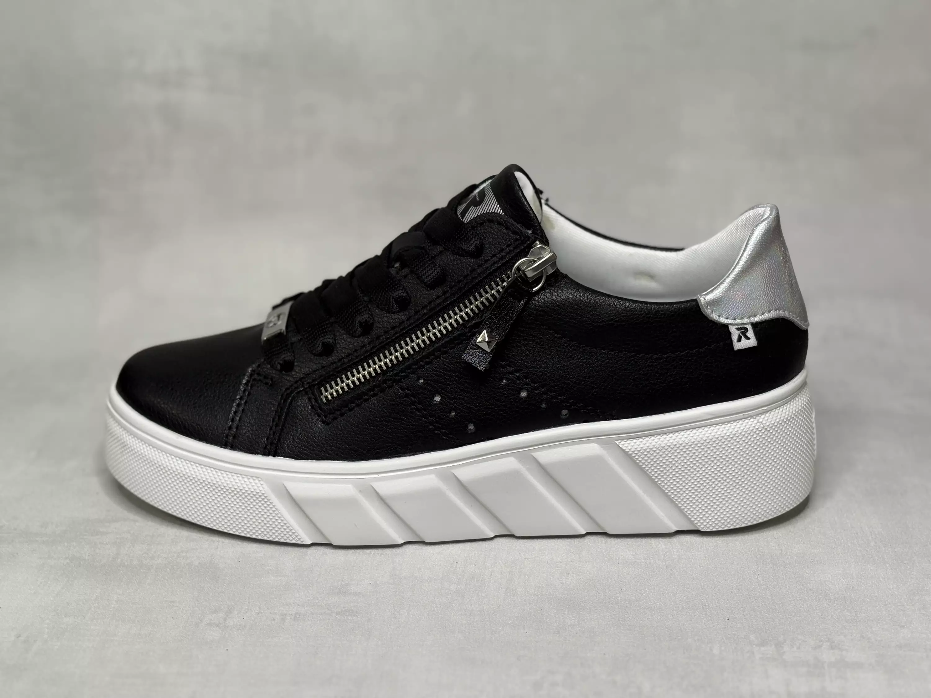 Mustat paksupohjaiset Rieker tennarit. Kannassa meatllinhohetinen hopeinen kantakappale. Nauhat, joiden avulla säädät kengät omaan jalkaan sopiviksi ja vetoketju joka helpottaa pukemista. Vaihdettavat Rieker Soft-pohjalliset, joiden tilalle sujautat tarvittaessa omiin jalkoihisi parhaiten sopivat pohjalliset. Kannan korkeus noin 4,5cm ja pohjan korkeus päkiän alta noin 2,5cm.