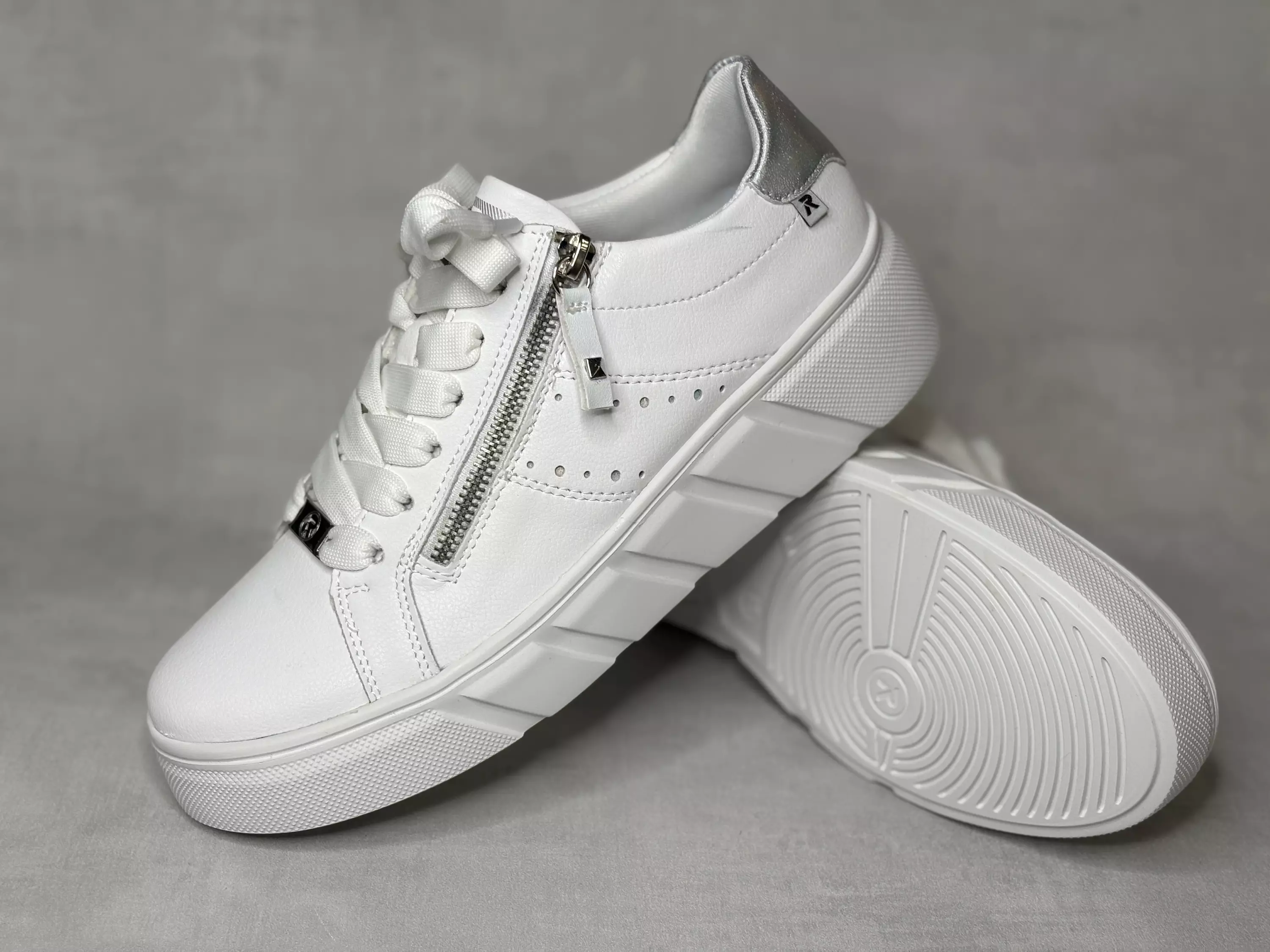 Valkoiset Rieker tennarit. Paksupohjaiset tennarit surffaavat trendien aallonharjalla. Nauhojen avulla kengät on helppo säätää omaan jalkaan sopivan kireälle ja ulkosyrjälle sijoitettu vetoketju vauhdittaa pukemista, toimien myös kenkien ykstiyiskohtana. Vetoketjun vetimessä pieni pyramidin mallinen hopean värinen niitti. Ulkosyrjällä koristeena pyöreät reikäkuvioit. Yksityiskohtana hopeanhohtoinen kantakappale. Kannan korkeus noin 4,5cm, pohjan korkeus päkiän alta noin 2cm.