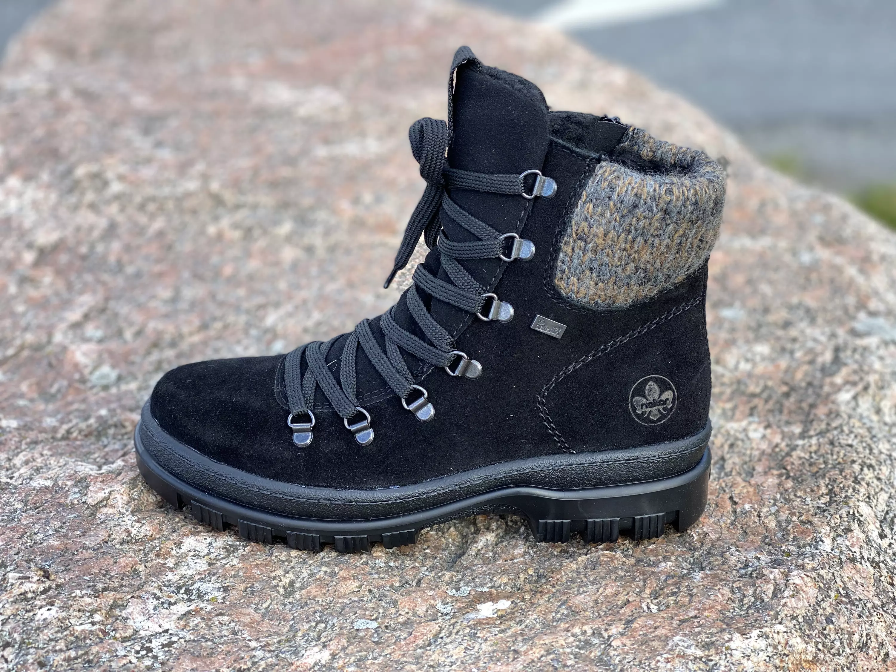 Mustat talvinilkkurit Rieker mallistosta. Pörröinen sisävuori pitää varpaat lämpöisinä. Sisäsyrjälle sijoitettu vetoketju helpottaa pukemista ja nauhoilla kenkä kiristyy vaivattomasti omaan jalkaan sopivaksi. Vaihdettavan pohjallisen tilalle sujahtaa tarittaessa omaan jalkaasi parhaiten sopiva pohjallinen. Ulkopohjassa nastat, jotka voi tarpeen vaatiessa kääntää käyttöön tai pois käytöstä. Kannan korkeus noin 3,5cm ja pohjan korkeus päkiän alta noin 2,5cm.