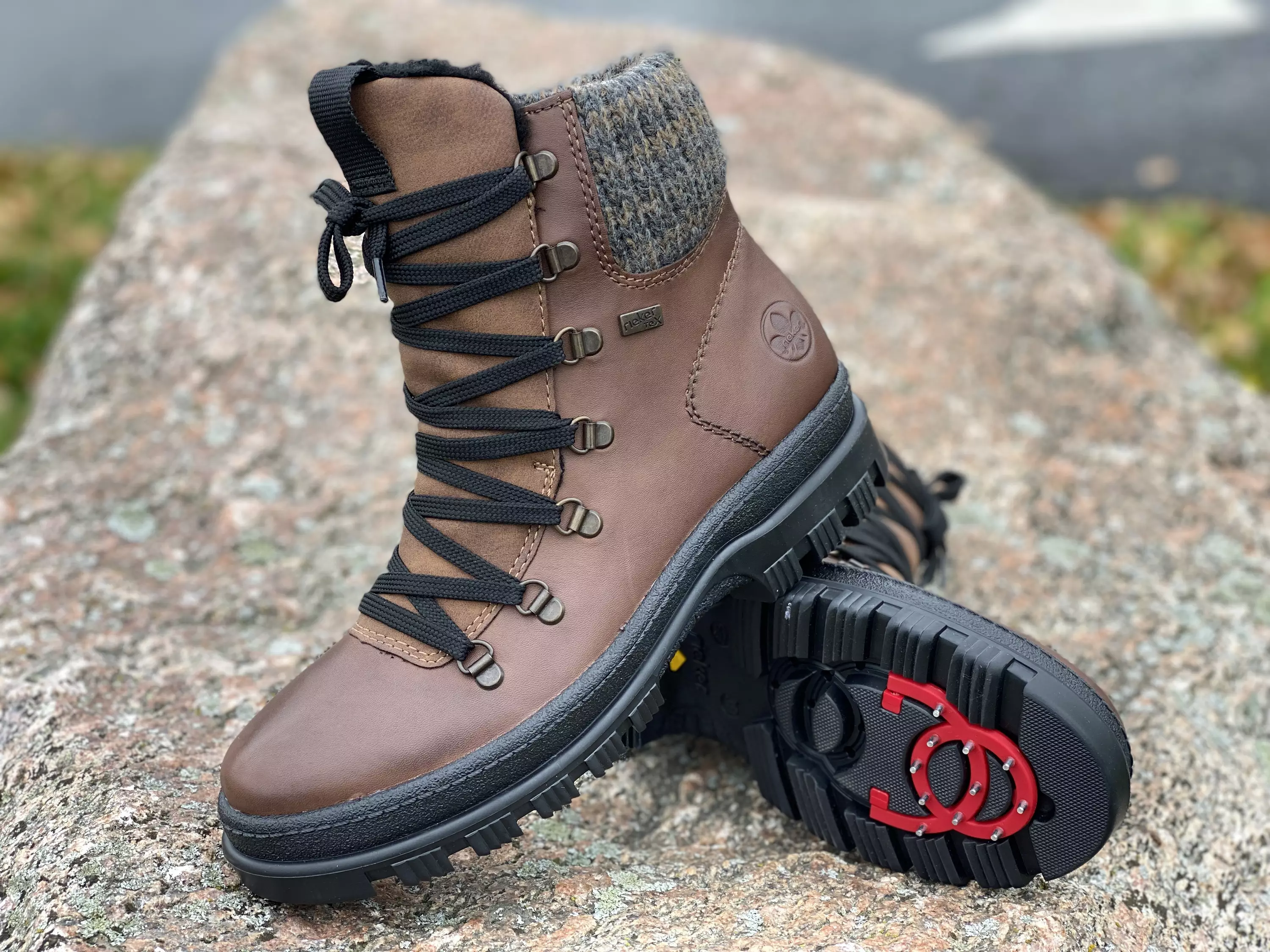 Ruskeat talvinilkkurit Rieker mallistosta. Pörröinen sisävuori pitää varpaat lämpöisinä. Sisäsyrjälle sijoitettu vetoketju helpottaa pukemista ja nauhoilla kenkä kiristyy vaivattomasti omaan jalkaan sopivaksi. Vaihdettavan pohjallisen tilalle sujahtaa tarvittaessa omaan jalkaasi parhaiten sopiva pohjallinen. Ulkopohjassa nastat, jotka voi tarpeen vaatiessa kääntää käyttöön tai pois käytöstä. Kannan korkeus noin 3,5cm ja pohjan korkeus päkiän alta noin 2,5cm.
