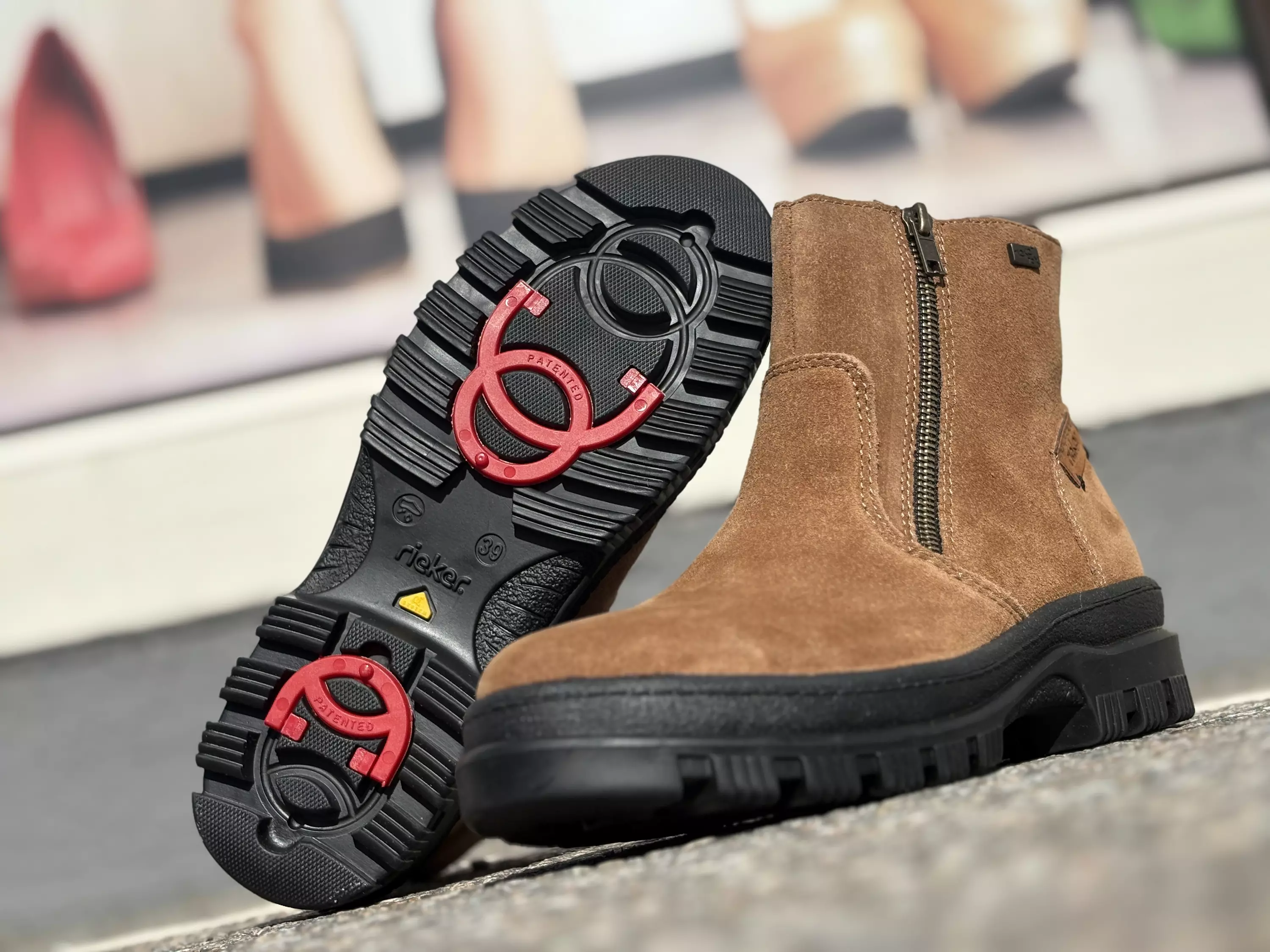 Ruskeat mokkanahkaiset talvinilkkurit Rieker mallistosta. Pörröinen sisävuori pitää varpaat lämpöisinä. Sisä- ja ulkosyrjille sijoitetut vetoketjut helpottavat pukemista ja tiivistävät kengät jalan ympärille. Vaihdettavan pohjallisen tilalle sujahtaa tarvittaessa omaan jalkaasi parhaiten sopiva pohjallinen. Ulkopohjassa nastat, jotka voi tarpeen vaatiessa kääntää käyttöön tai pois käytöstä.