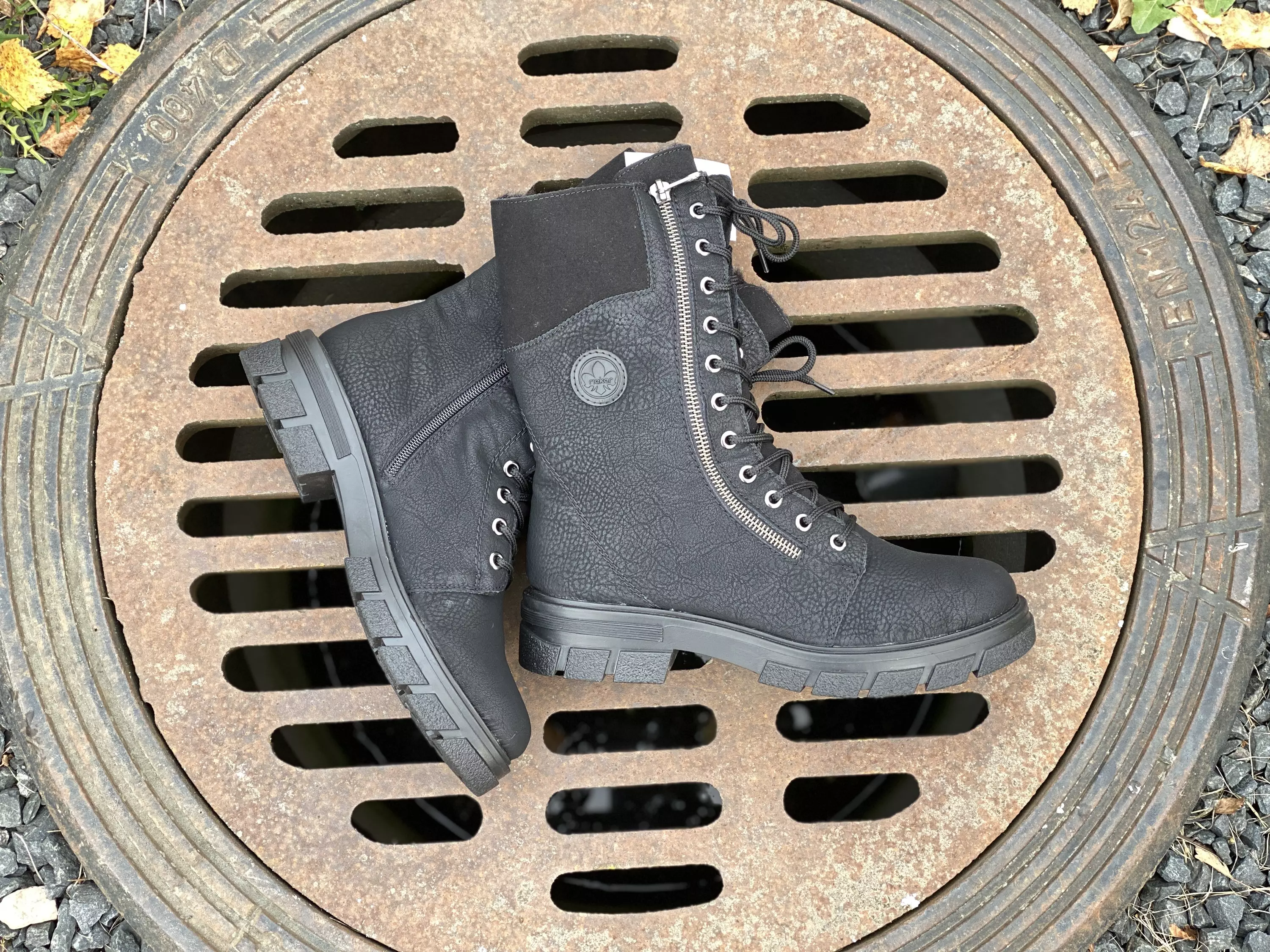 Pitkävartiset mustat Rieker maiharit. Näissä maihareissa on koristevetoketju ulkosyrjällä ja pukemista helpottava vetoketju sisäsyrjällä. Nauhoilla kenkä säätyy omaan jalkaan istuvaksi. Pörheä sisävuori pitää jalat lämpiminä.