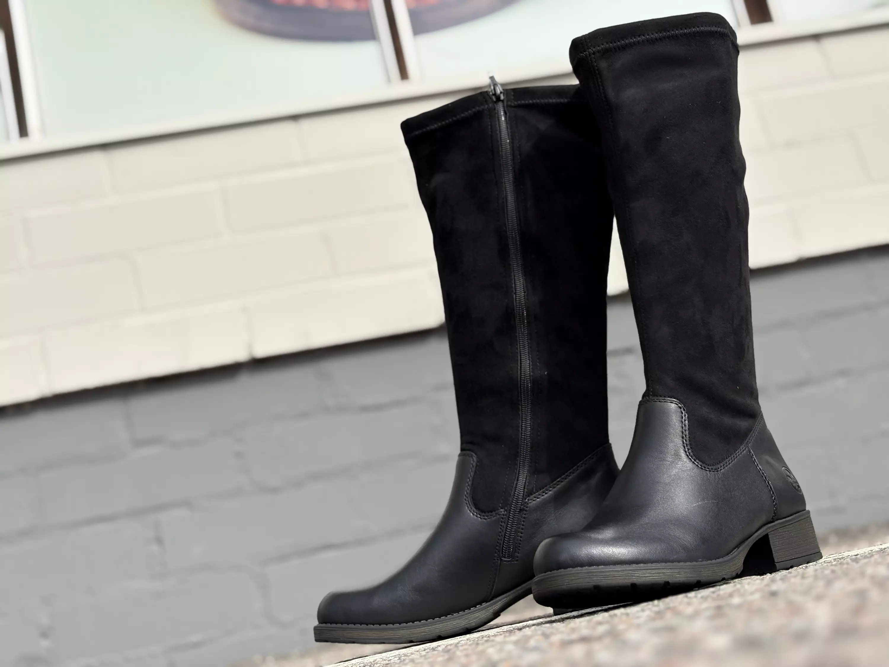 Mustat Rieker saappaat. Kärkiosaltaan nahkaiset pitkävartiset saappaat. Vuori on matalanukkaista fleeceä. Sisäsyrjällä pukemista vauhdittava vetoketju. Lestimitoitus kapea F. Kannan korkeus noin 3,5cm ja pohjan korkeus päkiän alta noin 1,5cm.