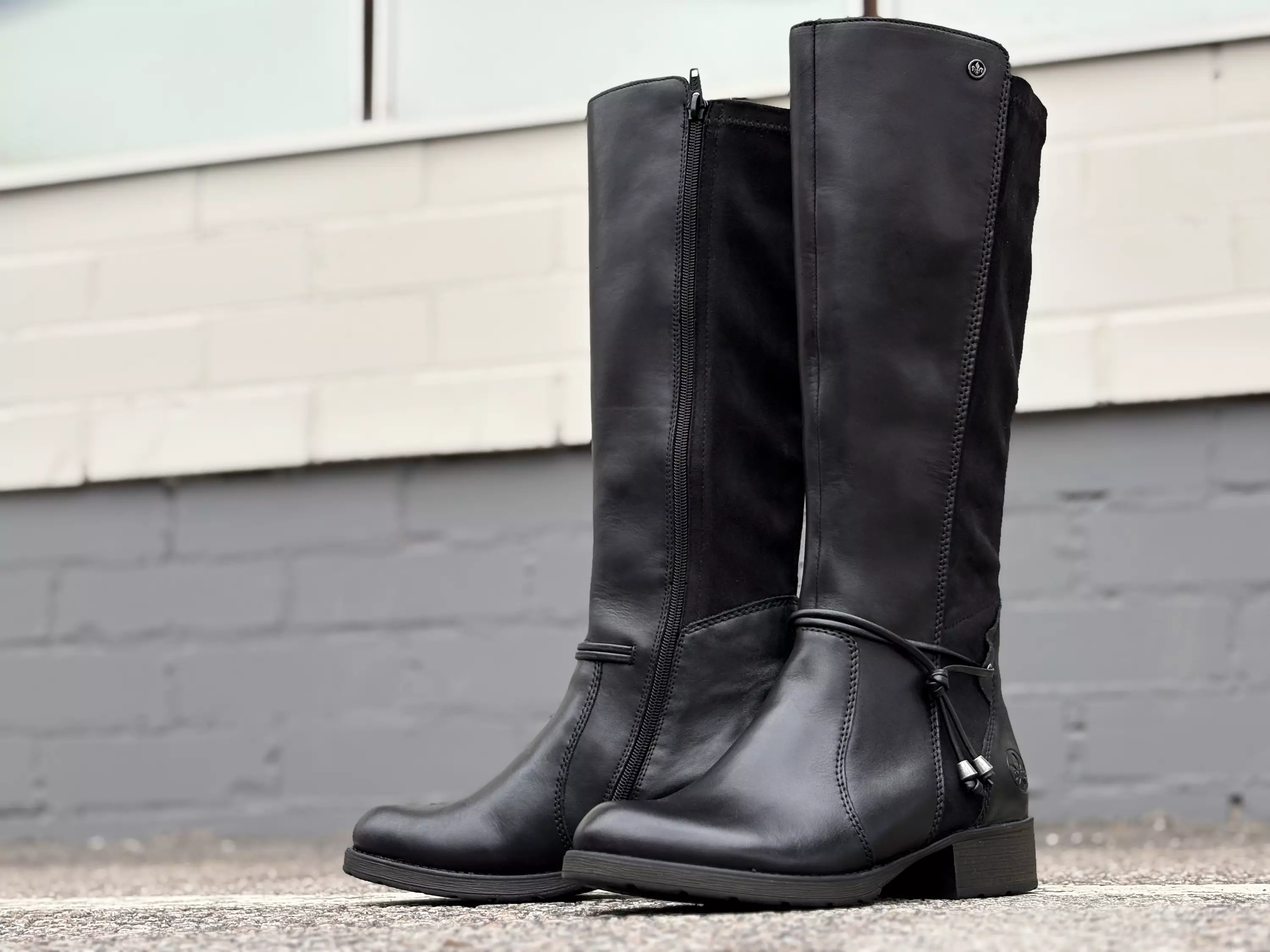 Mustat Rieker saappaat. Tekstiilisellä venykkeellä varustetut nahkasaappaat. Ulkosyrjällä koristeremmi. Varren yläreunassa metallin Rieker-vaakunalogo. Sisäsyrjällä pukemista vauhdittava vetoketju. Lestimitoitus kapea F. Kannan korkeus noin 3,5cm ja pohjan krokeus päkiän alta noin 1cm.
