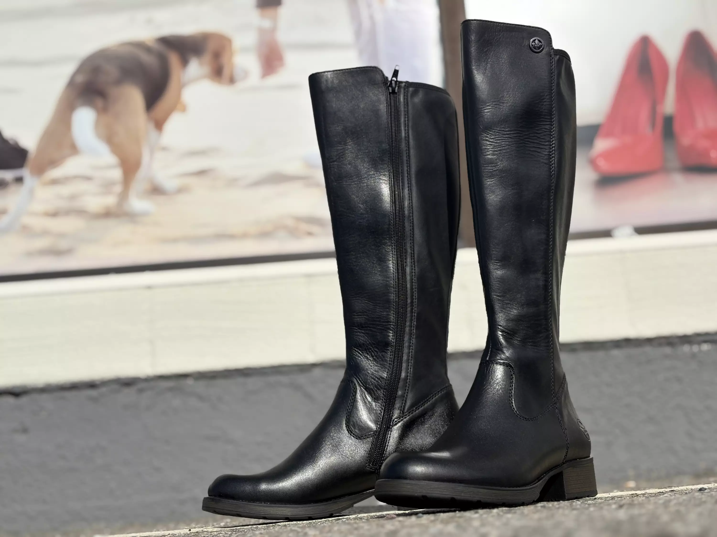 Mustat Rieker saappaat. Nahkaiset saappaat, joissa synteettinen, joustava varren takaosa. Varren yläreunassa metallinen Rieker-vaakuna. Sisäsyrjällä pukemista vauhdittava vetoketju. Pehmeä matalanukkainen teddy-vuori. Kiinteät huopapintaiset pohjalliset. Kapea F lesti. Kannan korkeus noin 3,5cm ja pohjan korkeus päkiän alta noin 1,5cm.