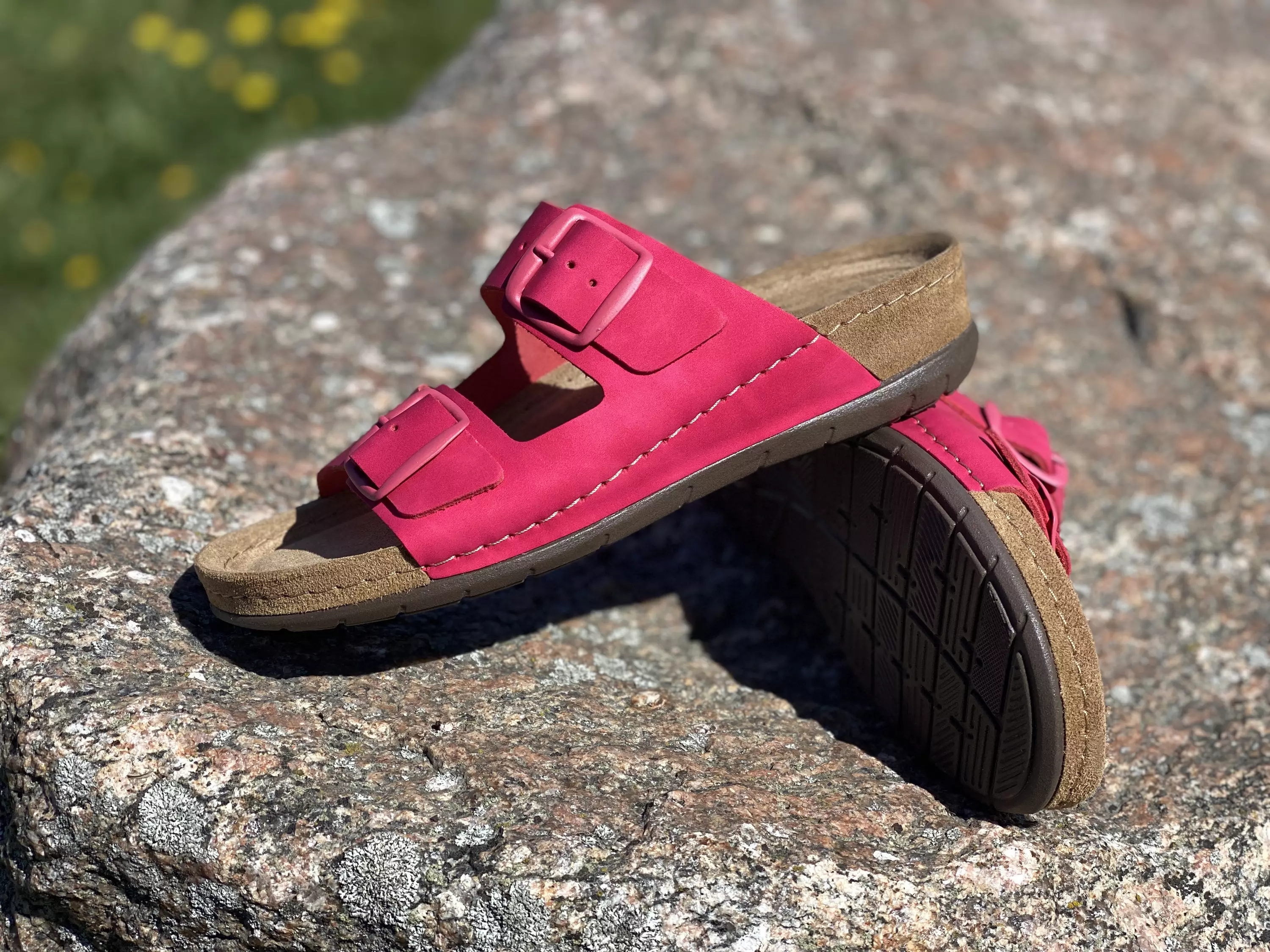 Kirkkaan pinkit Rohde sandaalit. Kahdella pinkillä solkisäätöisellä remmillä varustetut nahkapohjaiset sandaalit. Pehmustettu sisäpohja. Kannan korkeus noin 3cm, pohjan korkeus päkiän alta noin 1,5cm. Tummanruskea ulkopohja.
