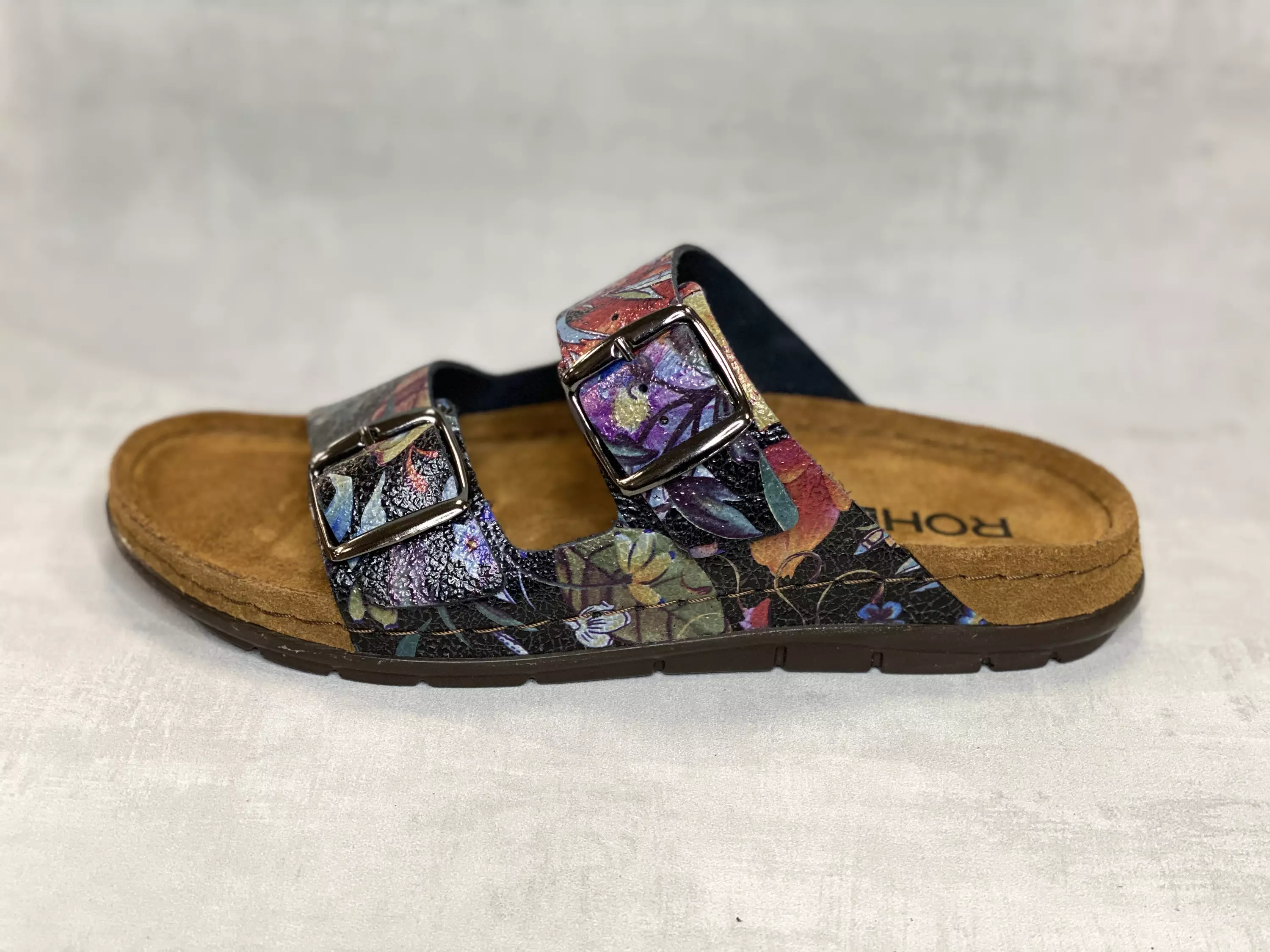 Pääväriltään mustat kukkakuvioiset Rohde sandaalit kahdella soljellisella remmillä