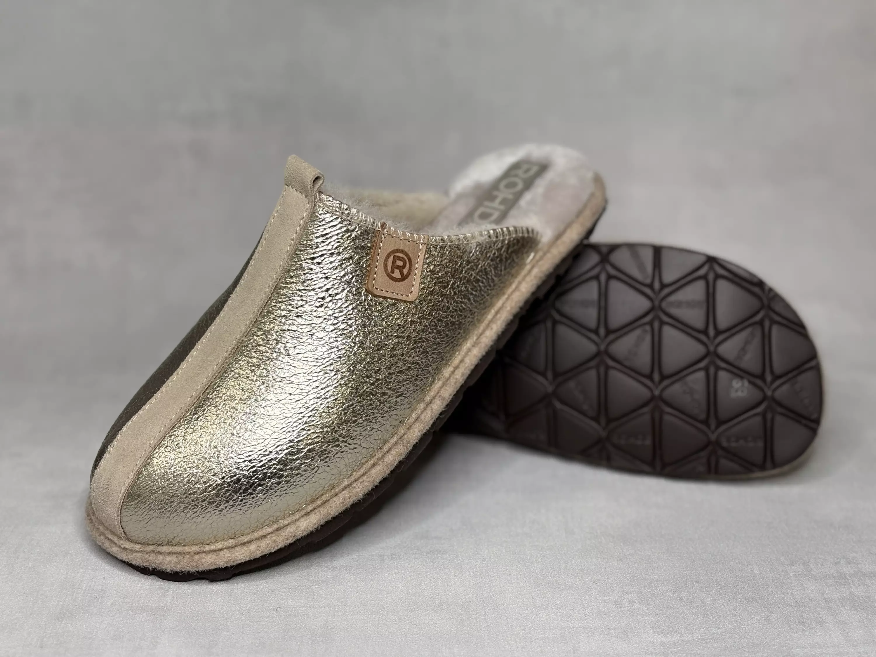 Kultaiset Rohde aamutossut. Nahkapintaiset turkisvuoriset aamutossut pitävät varpaat lämpöisinä. Yksityiskohtana beige mokkanahkainen raita ja ulkosyrjällä Rohde R-merkki.