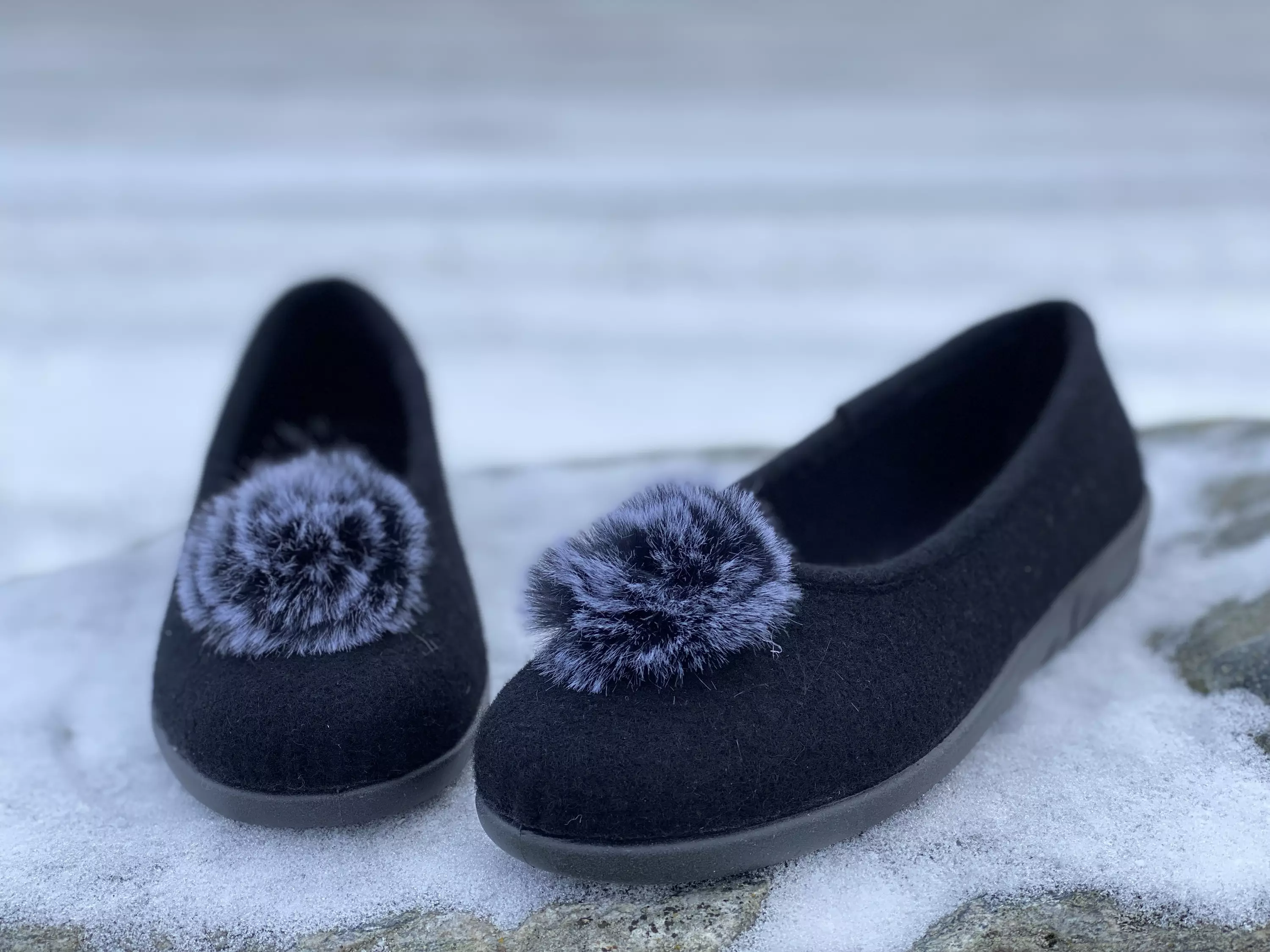 Mustat Rohde huopatossut. Ballerinamainen huopatossu sisäkäyttöön. Harmaa pörrötupsu on sievä yksityiskohta.