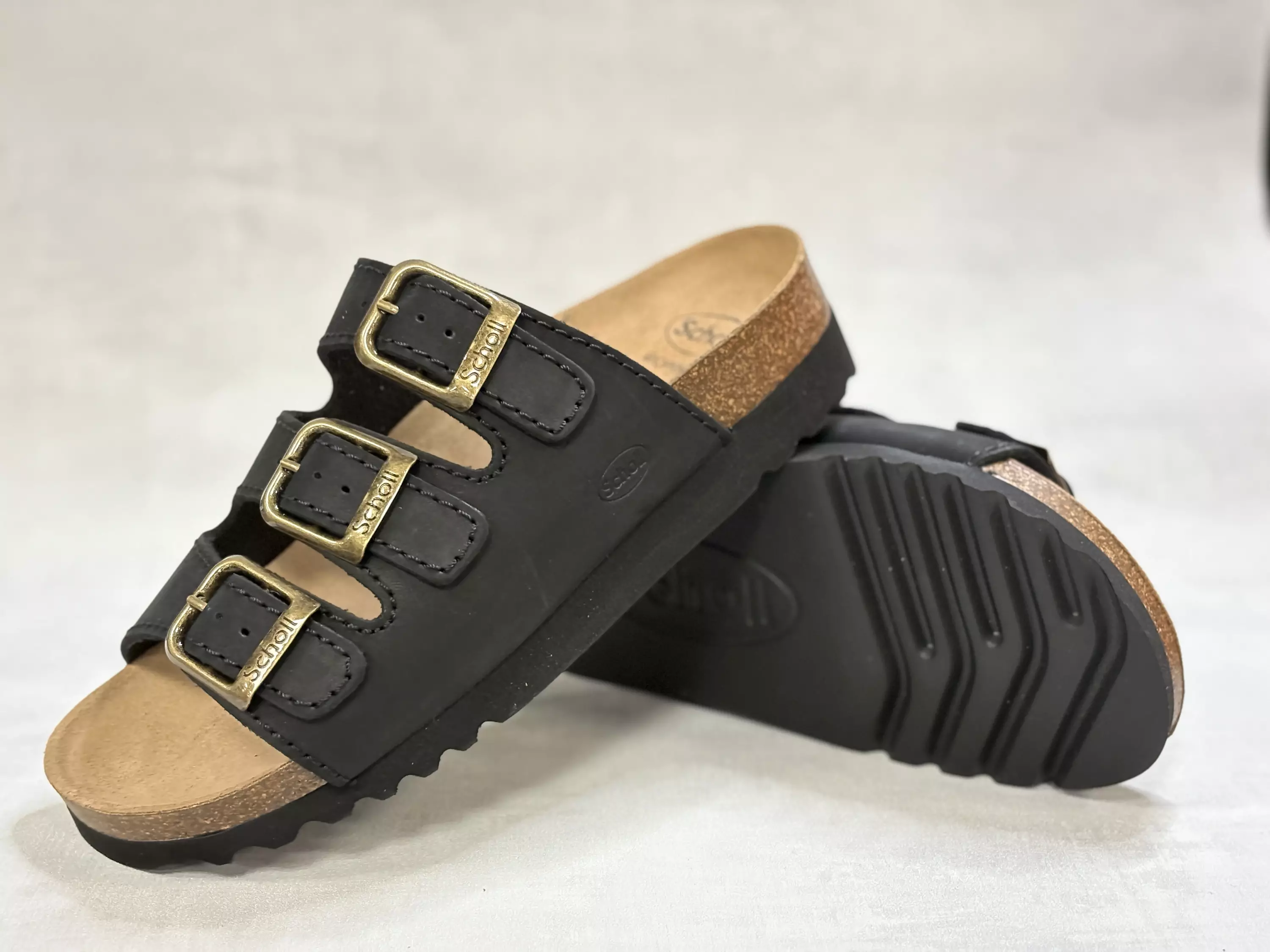 Mustat Scholl remmisandaalit, joissa on Bioprint adapta-jalkapeti. Sisäpohja on suunniteltu ehkäisemään ja vähentämään väärän asennon aiheuttamia polvikipuja. Näillä sandaaleilla jalka on hyvin tuettu ja askellus taittuu rennosti.