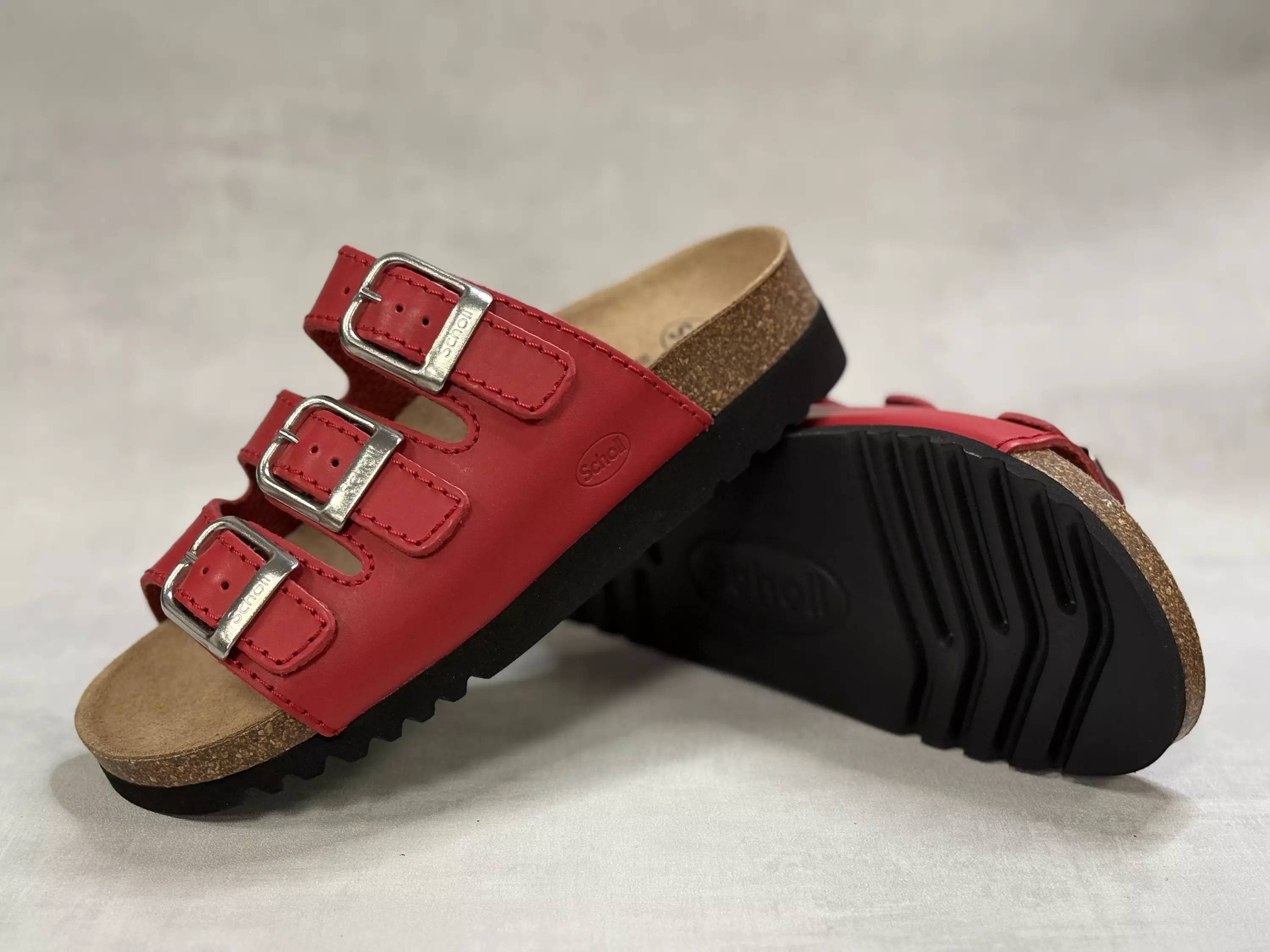 Pirteän punaiset Scholl sandaalit, joissa on Bioprint adapta-jalkapeti. Sisäpohja on suunniteltu ehkäisemään ja vähentämään väärän asennon aiheuttamia polvikipuja. Näillä sandaaleilla jalka on hyvin tuettu ja askellus taittuu rennosti.