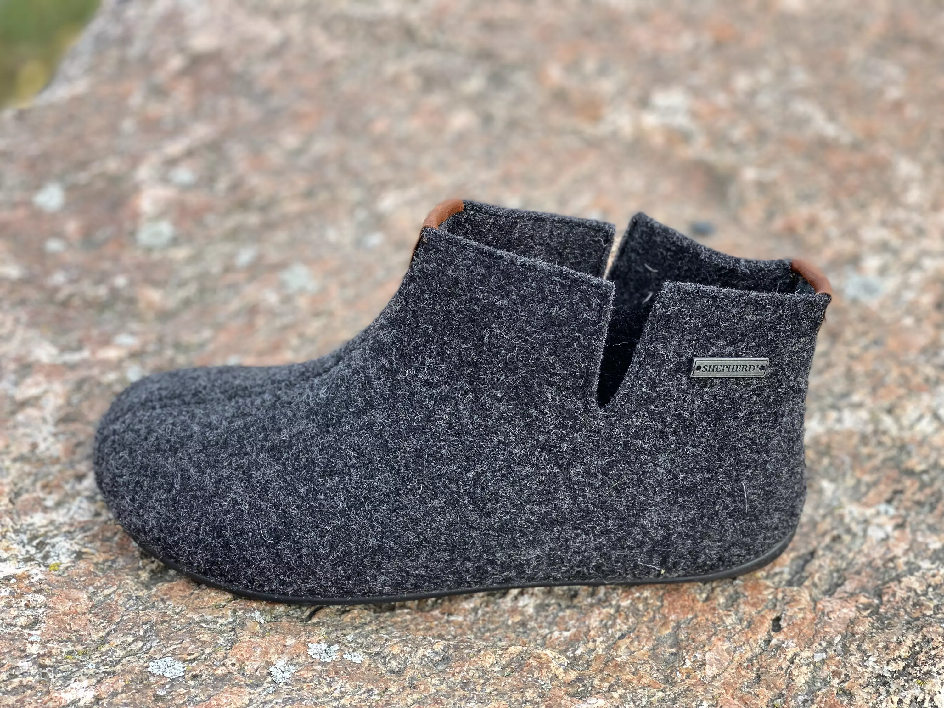 Tummanharmaat Shepherd of Sweden huopatossut. Mahtavat aamutossut ja sopivat myös vaikkapa toimistokäyttöön. Materiaali on lämmintä huovutettua villaa. Sisäpohjallinen on muotoiltu. Tossujen ulkopohja on kumia.