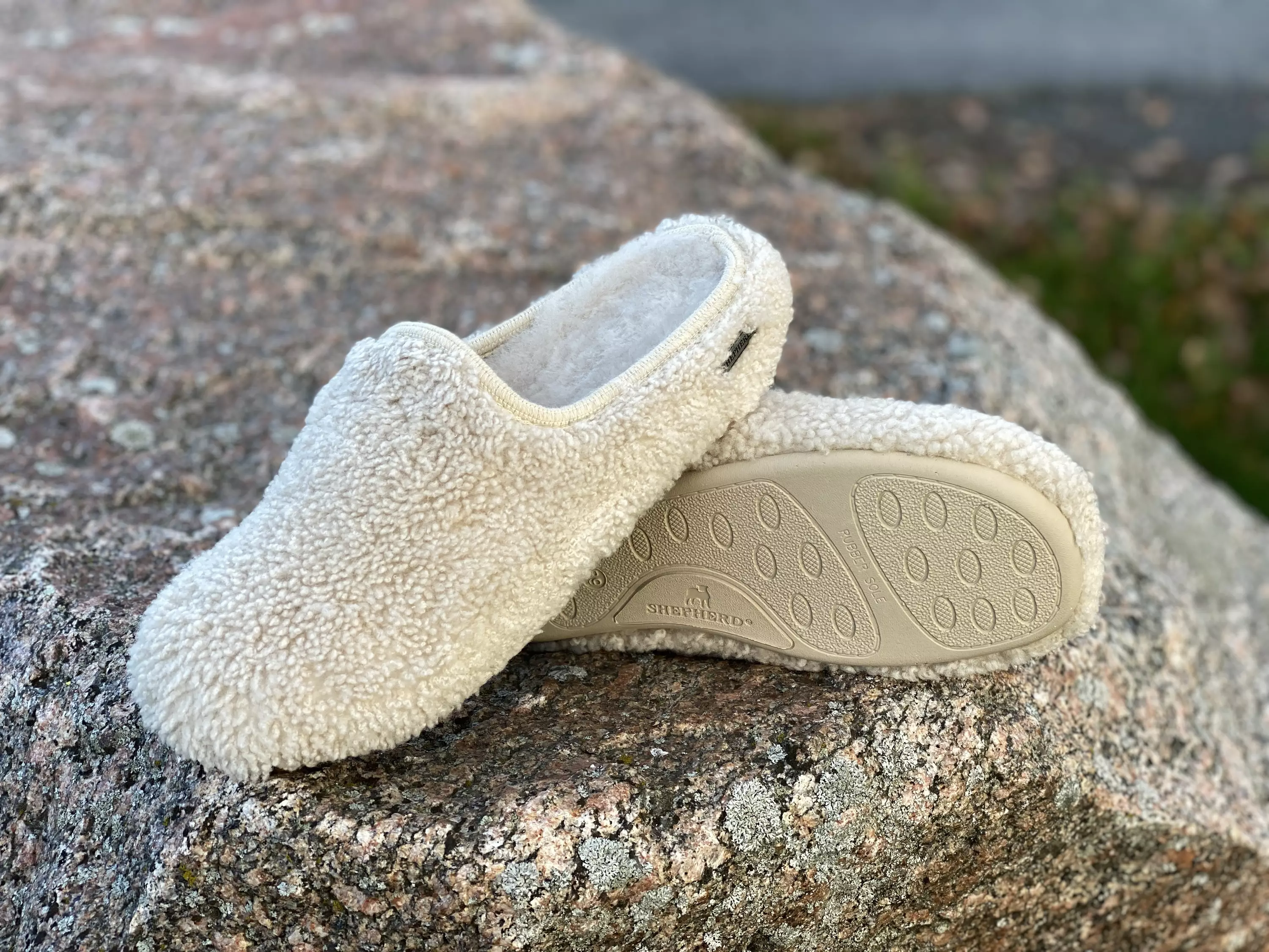 Kermanvalkoiset Shepherd of Sweden Rosie aamutossut. Kenkien ulkosyrjillä on pienet metalliset Shepherd-tekstillä varustetut koristeet. Jalan alla mukautuvalla korkkipohjallisella varustetut tossut ovat pehmeät ja lämpimät. Pohjallisen turkispinta auttaa jalkoja pysymään lämpiminä. Tarvittaessa vaihdat pohjallisten tilalle omia tarpeitasi parhaiten vastaavat pohjalliset. Kumipohjissa on sisätiloissa hyvä pito.