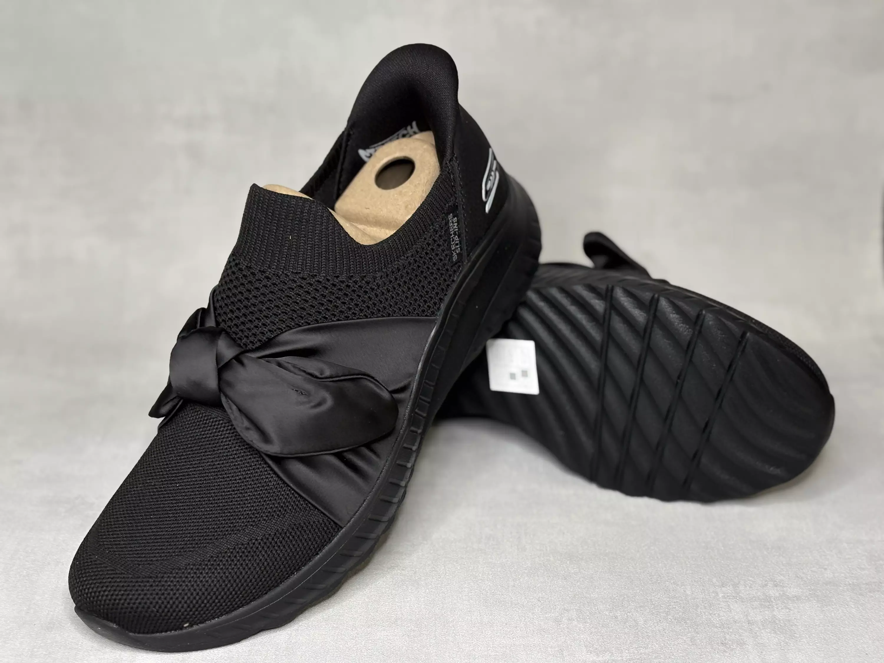 Mustat rusettikoristeiset Skechers Bobs Squad Chaos - Inspire Away Slip-ins tennarit. Satiinirusetilla koristetut Skechers Bobsit ovat yksi suosituimmista Skechers malleista ja tällä kertaa se on saatavilla Slip-ins kenkälusikkanalla varustettuna!