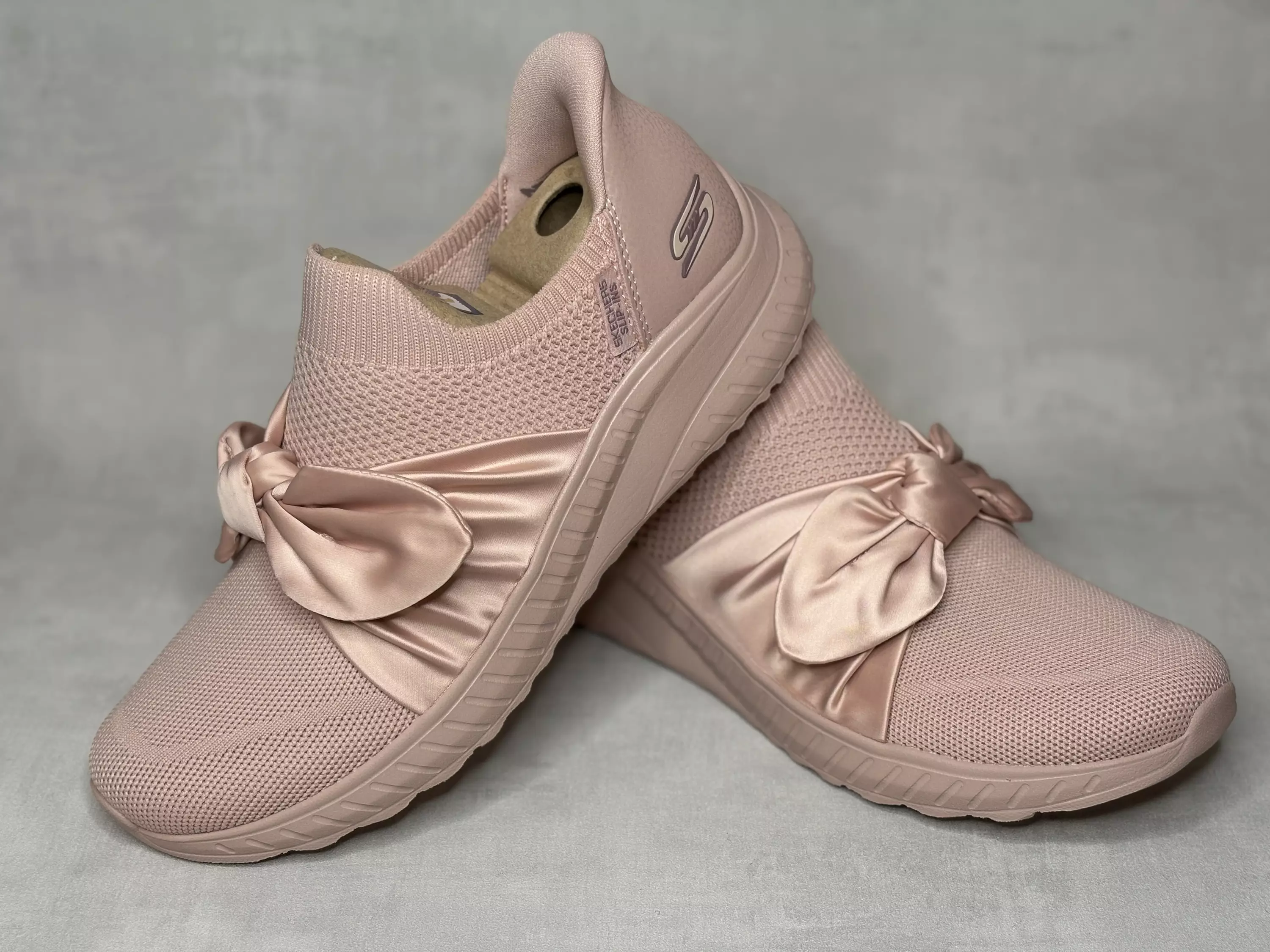 Vaaleanpunaiset rusettikoristeiset Skechers Bobs Squad Chaos - Inspire Away Slip-ins tennarit. Satiinirusetilla koristetut Skechers Bobsit ovat yksi suosituimmista Skechers malleista ja tällä kertaa se on saatavilla Slip-ins kenkälusikkanalla varustettuna!