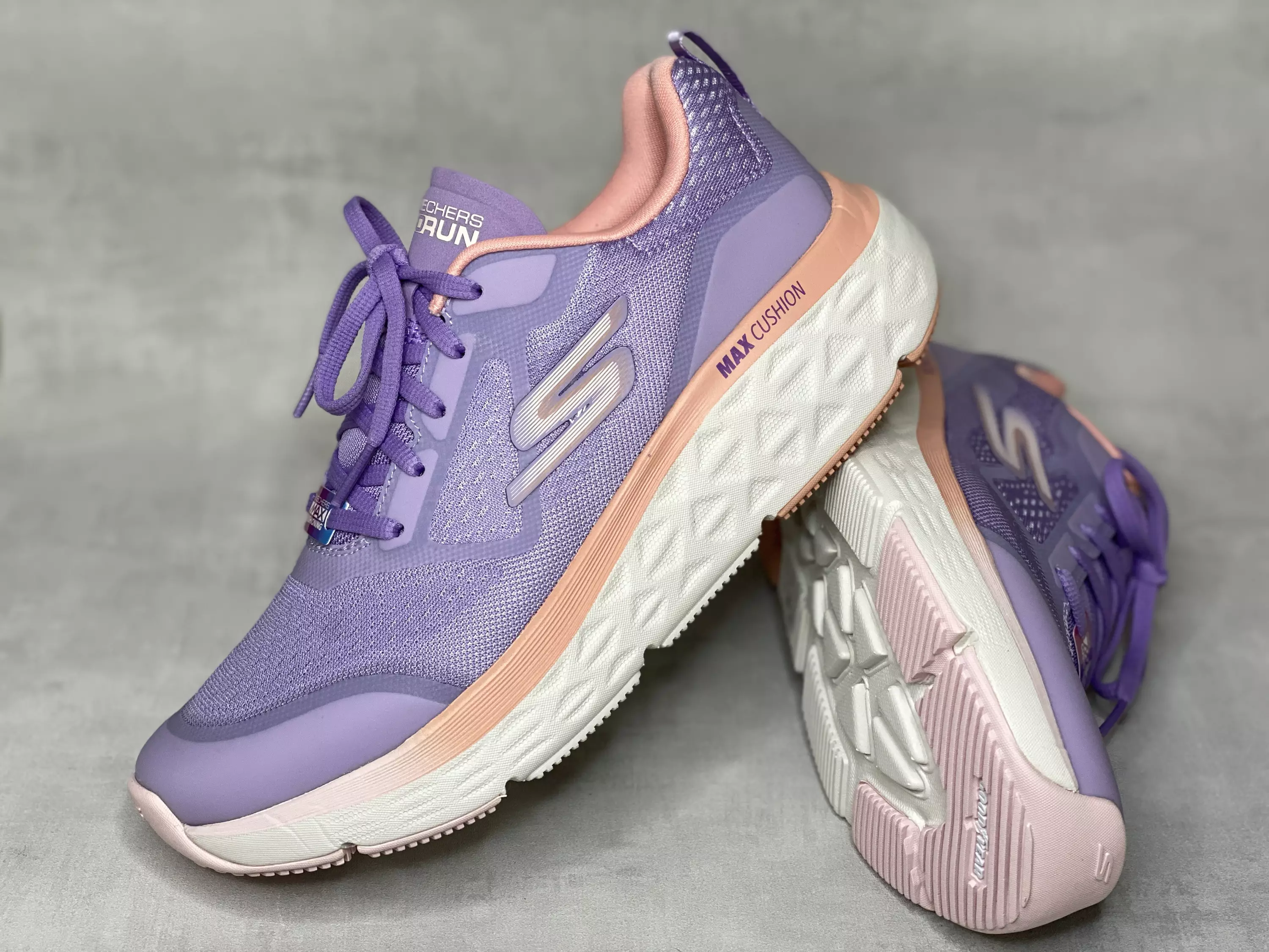 Laventelin liilat Skechers Max Cushioning Delta - Ultimate Endurance lenkkarit. Persikkaisen vaaleanpunaiset yksityiskohdat. Kannassa vetolenkki.