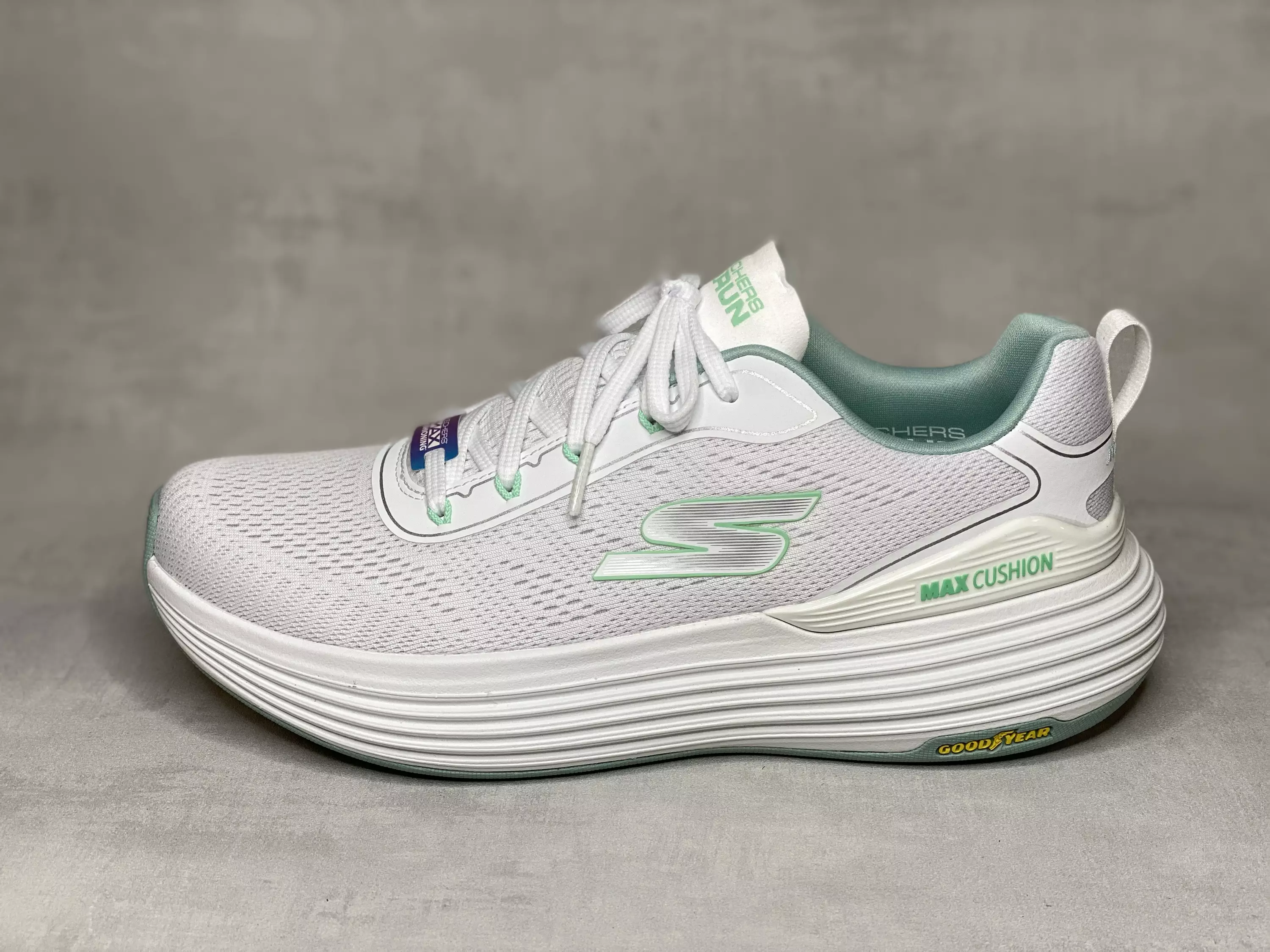 Valkoiset Skechers Max Cushioning Suspension -Voyager lenkkarit. Mintunvihreillä yksityiskohdilla varustetut pehmustetut lenkkarit.