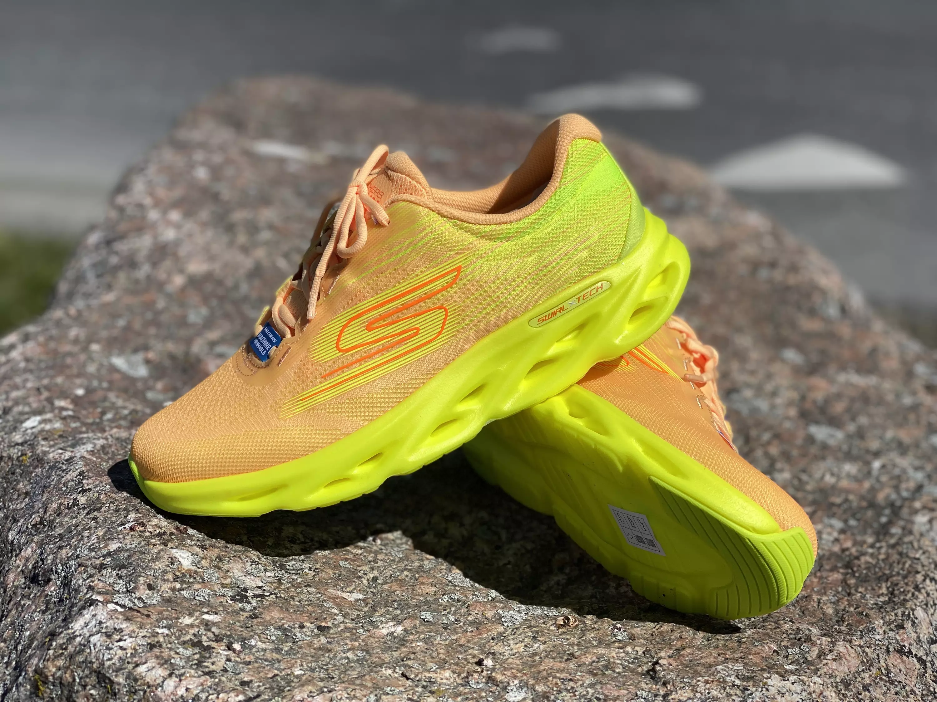 Oranssi-keltaiset Skechers Go Run Tech Speed - Ultimate Stride lenkkarit. Hyper Burst-välipohjalla varustetut Swirl Tech-ulkopohjaiset lenkkarit. Sisäpohjana on Skechers Air-Cooled Goga Mat-, joka tarjoaa sekä iskunaimennsuta, että mukavuutta. Ulkopohjassa Goodyear pitoalueet, jotka takaavat erinomista pitoa kaikenlaisille juoksupoluille.