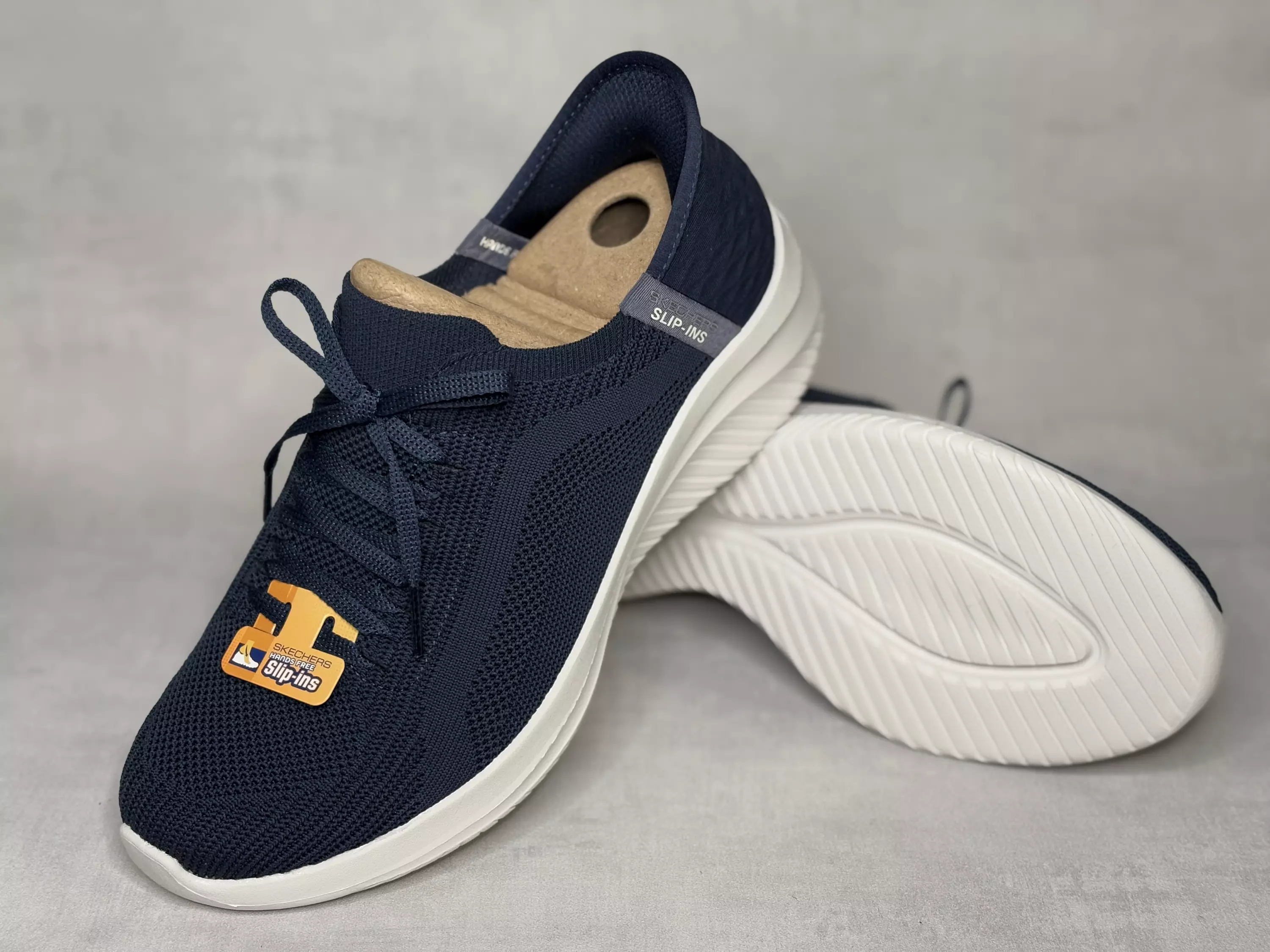 Tummansiniset nauhalliset Skechers Ultra Flex 3.0 Brilliant Path Slip ins-lenkkarit! Leveä lesti! Slip-ins kenkälusikkakannan ansiosta kenkä sujahtaa jalkaan helposti ja vaivattomasti! Kantapäässä neopreenivahvike, joka muotoutuu kantapään ja akillesjänteen luonnolliseen kaareen. Air Cooled Memory Foam sisäpohja on kevyt, muotoutuu jalan mukaan, vaimentaa iskuja ja tuo helpotusta kipeille jaloille. Kenkien joustava pinta mukailee jalkaa täydellisesti.