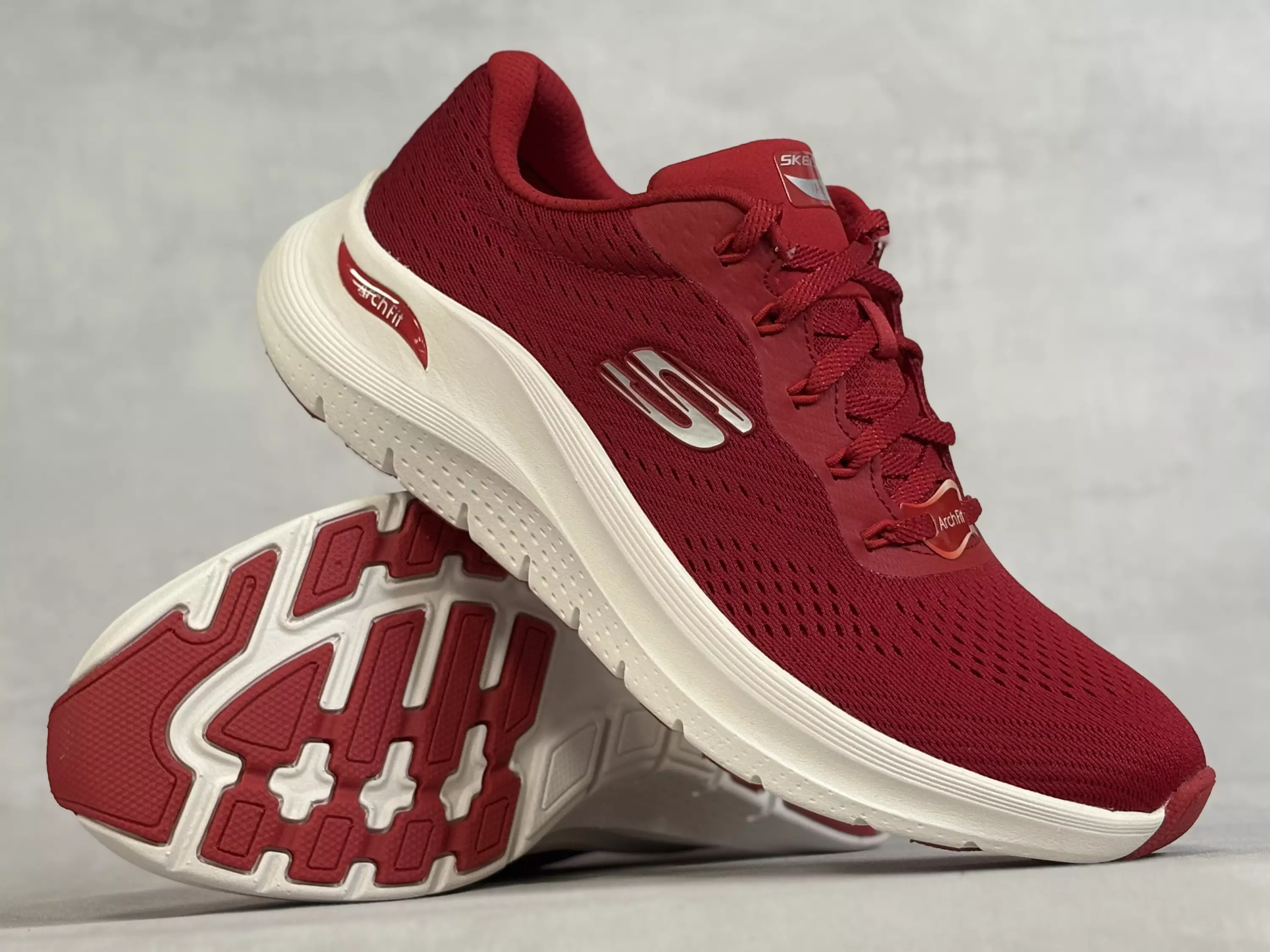 Punaiset Skechers Arch Fit - Big league lenkkarit. Tekstiilipintaiset Skechers-lenkkarit on varustettu vaihdettavilla Arch Fit-pohjallisilla! Nauhojen avulla säädät kengät heposti omaan jalkaan sopiviksi. Kannan korkeus noin 4cm ja pohjan korkeus päkiän alta noin 2cm.