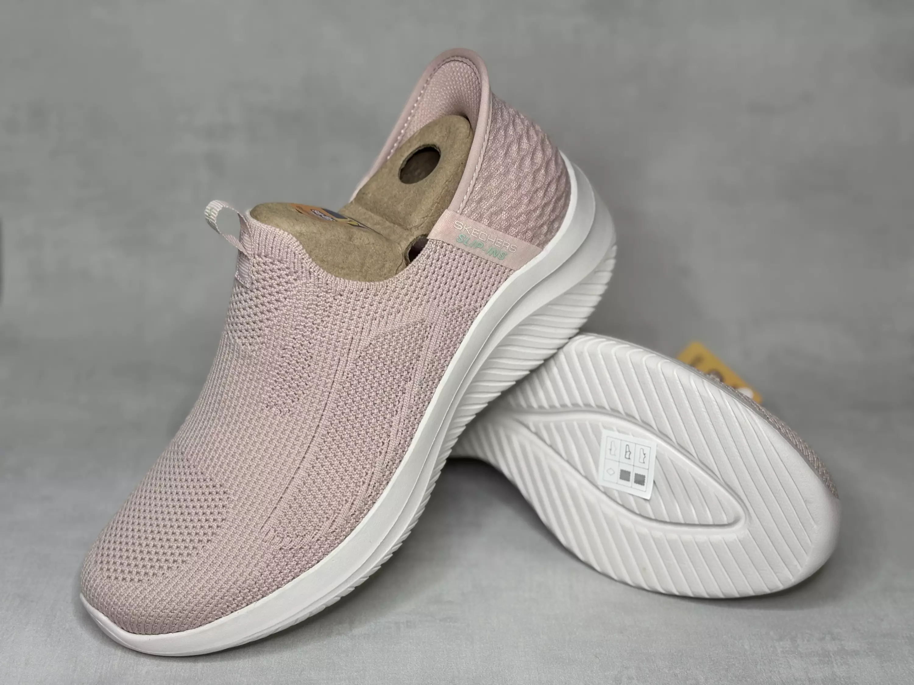 Vaaleanpunaiset Skechers Ultra Flex 3.0 - Easy Win Slip-ins lenkkarit. Slip-ins kenkälusikkakannalla varustetut Skechers kävelykengät sujahtavat vaivattomasti jalkaan. Jalkaan mukautuvat Skechers Air-Cooled Memory foam-pohjalliset.