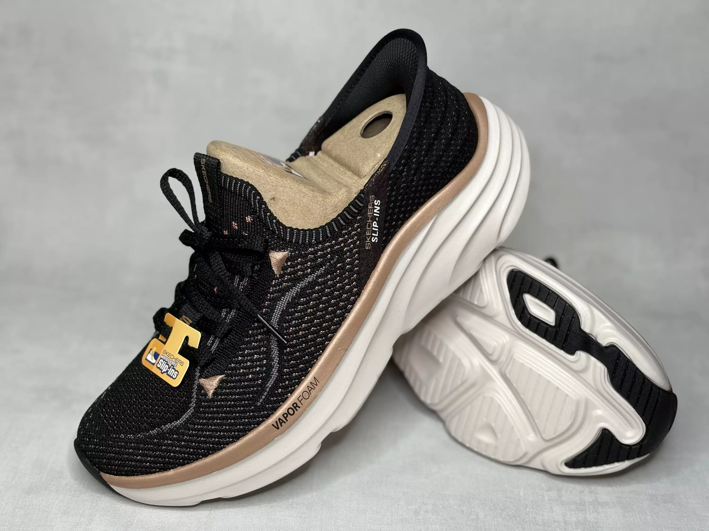 Ainutlaatuinen Vapor foam-rakenne on suunniteltu iskunvaimennusta varten. Pehmeys takaa jaloille mukavan tunteen. Kiinteät Skechers Memory Foam-pohjalliset tarjoavat jalalle tarvittavan lisätuen. Nämä lenkkarit ovat unelmankevyet ja pohjan vaalean kultainen raita tarjoaa kenkien ulkonäköön viimeisen silauksensa.