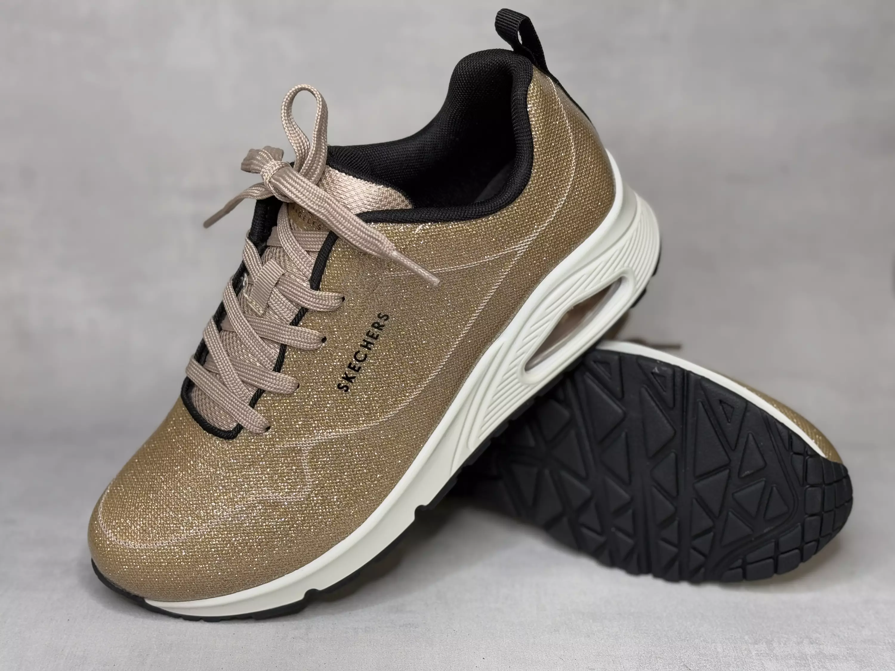 Shampanja kultaiset Skechers Uno - Diamond Shatter - Champagne lenkkarit. Shampanjakultainen timantinhohteinen pinta. Nauhojen avulla kengät säätyvät sujuvasti omaan jalkaan sopiviksi. Pehmeät Skechers Air Cooled Memory-Foam pohjalliset.