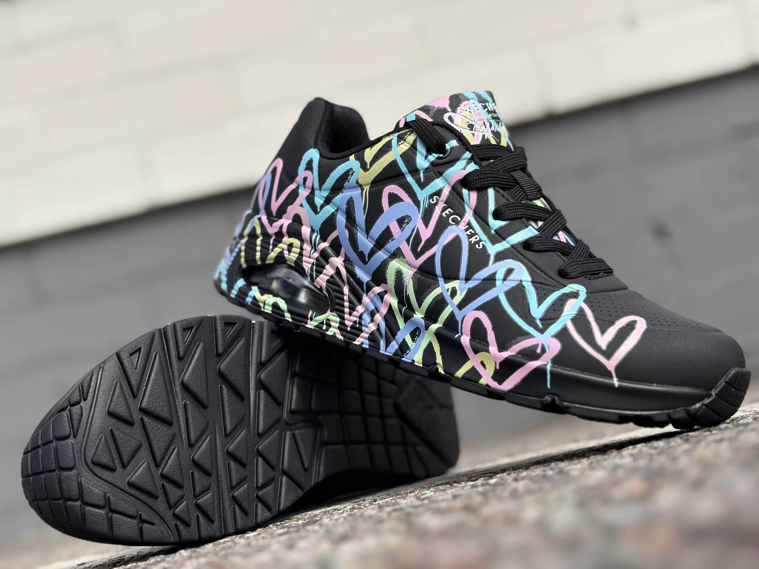 Kansainvälisesti tunnetun muralisti James Goldcrownin ikoninen Lovewall-sydänteos nyt myös Skechersin mallistossa, tällä kertaa mustana sydänten koreillessa monissa eri sävyissä! Kengän kuviointi kulkee kengän ulkosivussa pohjaa myöten. Pehmeä Air-Cooled Memory Foam sisäpohjallinen muotoutuu jalkaan, tarjoten välitöntä mukavuutta ja hengittävyyttä jalalle.