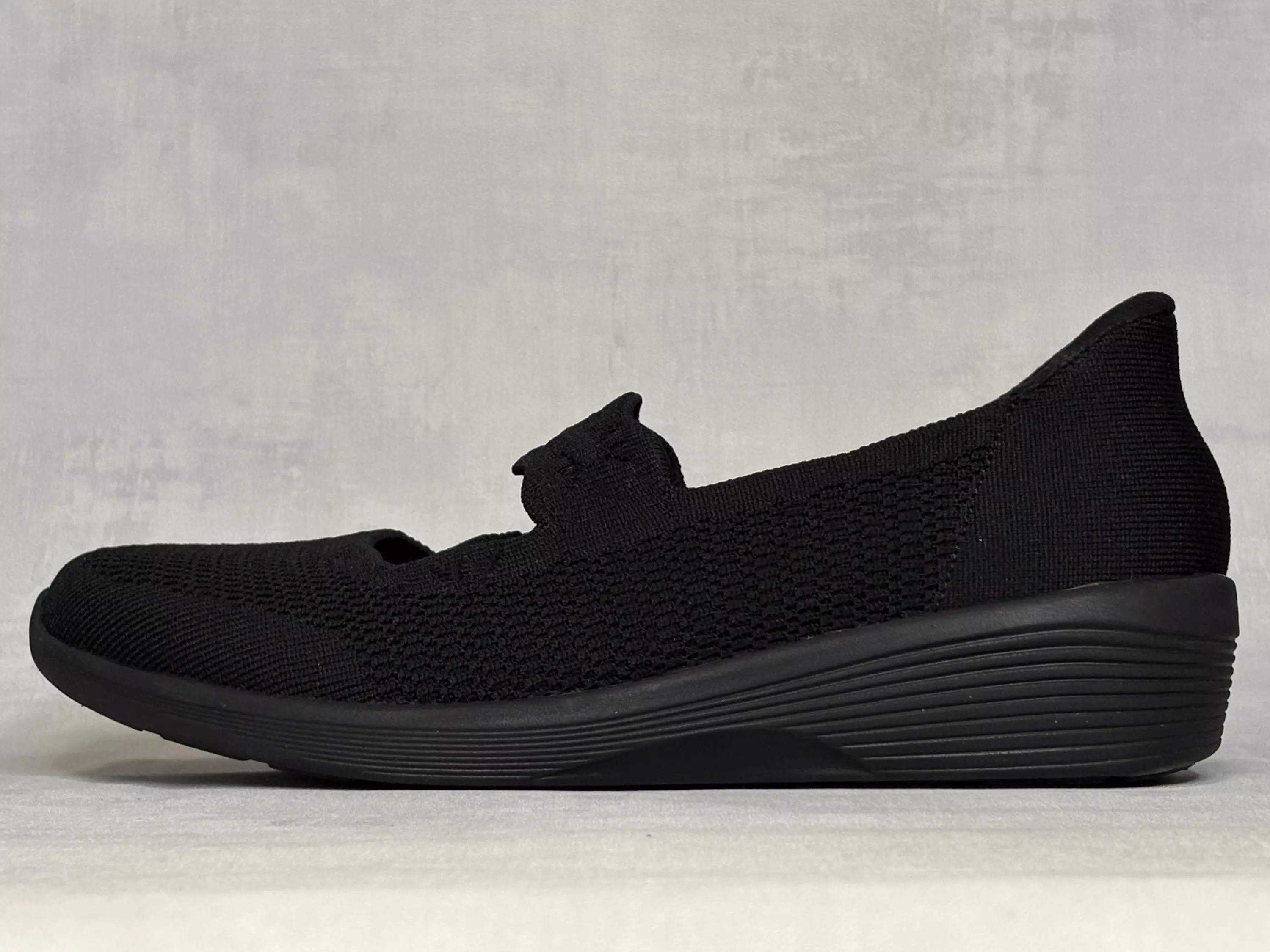Mustat Skechers Arya - Subtle Gleam kävelykengät. Slip-ins kenkälusikkakannalla varustetut tekstiiliset kävelykengät. Joustava pääliremmi. Normaali lesti, Skechers classic fit. Kannan korkeus noin 4cm ja pohjan korkeus päkiän alta noin 1cm